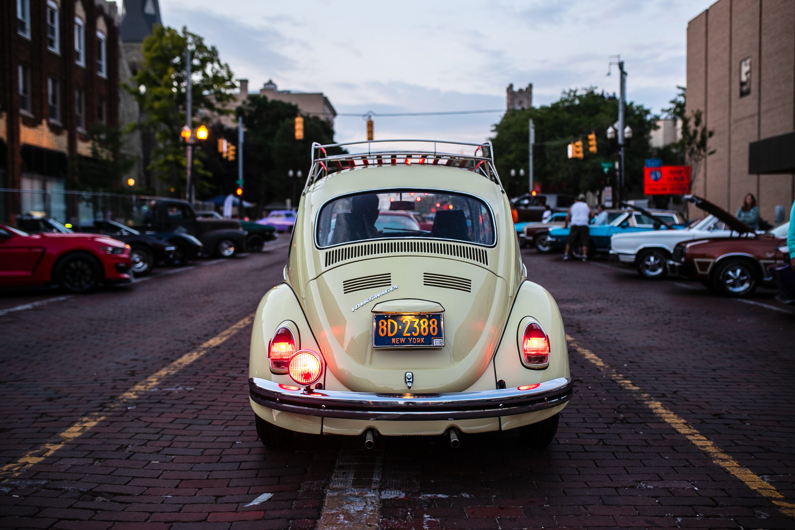A vintage Volkswagen Beetle rides down the bricks of Saginaw Street in the early hours of the morning during the 18th annual Back to the Bricks car show & cruise in Downtown Flint on Saturday, Aug. 20, 2022. (Jenifer Veloso | Flint Beat)