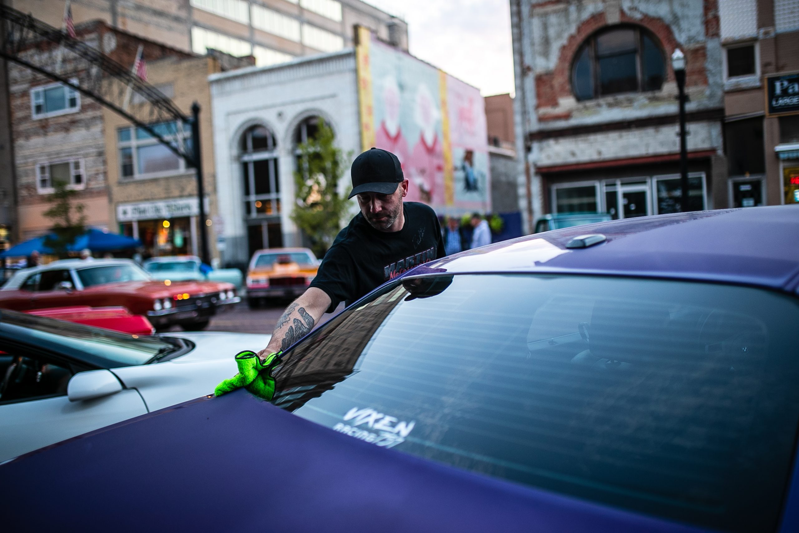 A muscle-car owner wipes the morning dew off his Dodge Charger after parking the vehicle to sit on display during the 18th annual Back to the Bricks car show & cruise in Downtown Flint on Saturday, Aug. 20, 2022. (Jenifer Veloso | Flint Beat)