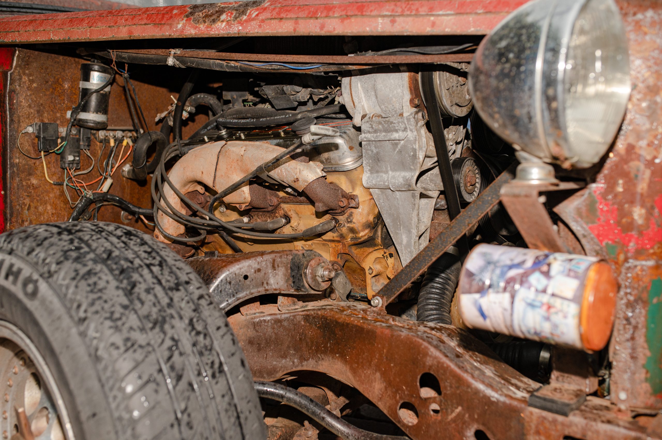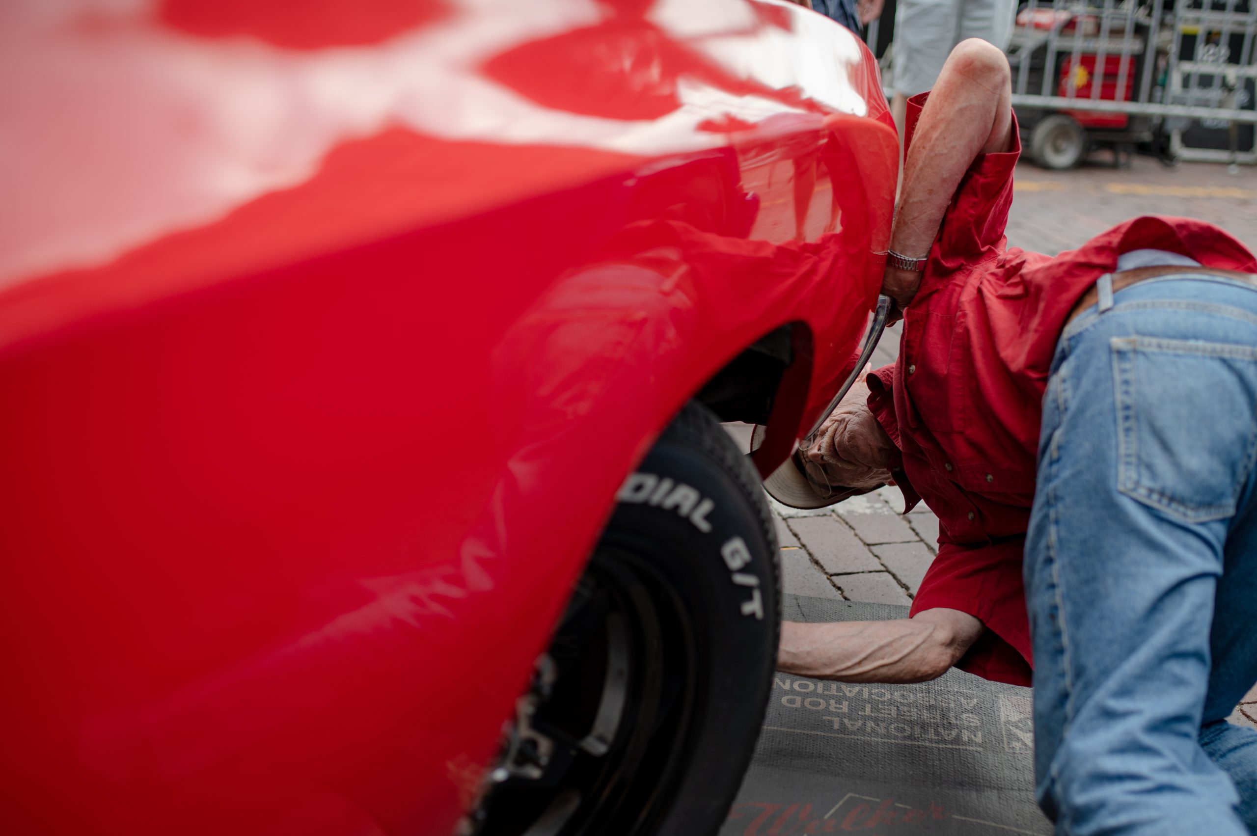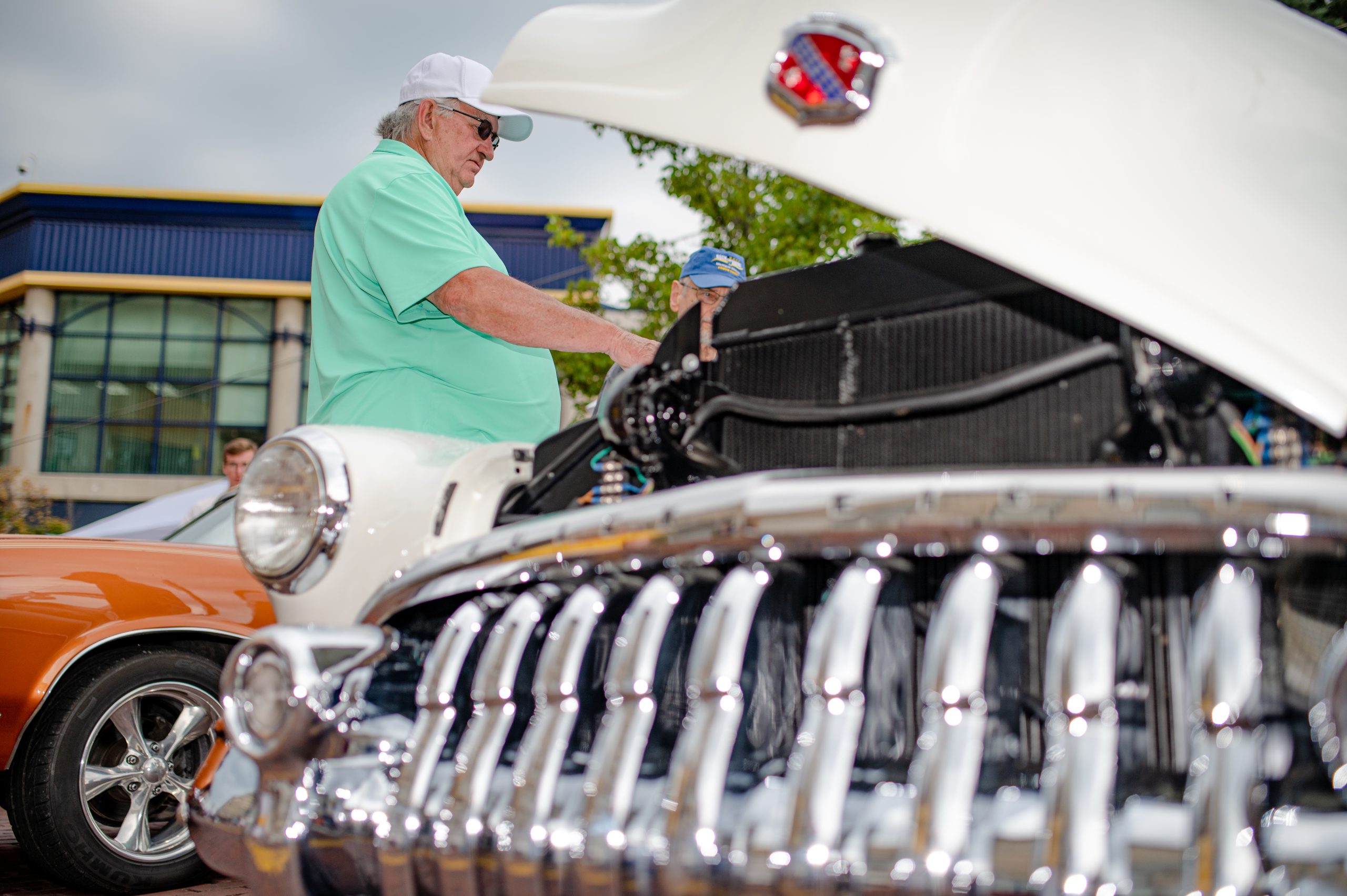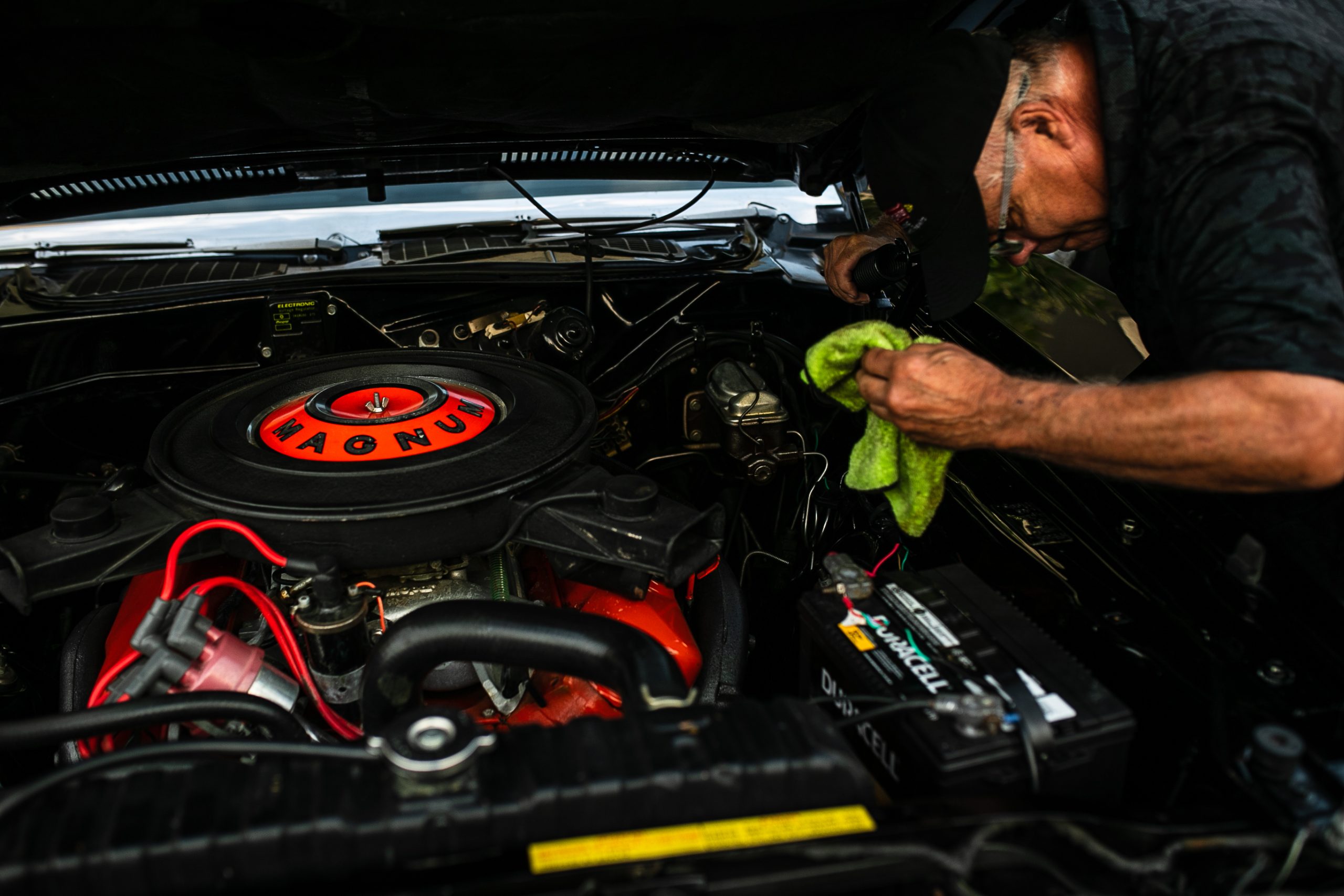 A proud vintage car owner wipes down the carburetor of his car to sit on display in the early hours of the morning during the 18th annual Back to the Bricks car show & cruise in Downtown Flint on Saturday, Aug. 20, 2022. (Jenifer Veloso | Flint Beat)