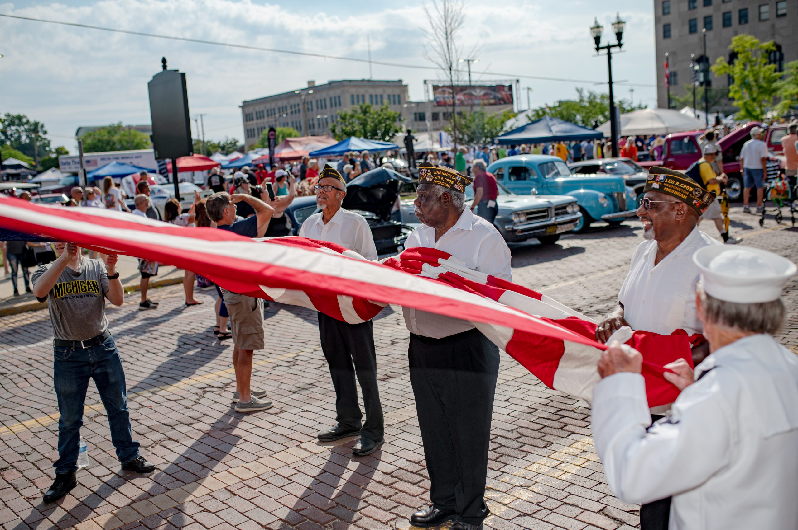 VFW 8236 members Sgt. Benny Motley, Sgt. Bernard Holmes and Sgt. Edward Moore unroll the American flag during the Back to the Bricks opening ceremony in Downtown Flint, Mich. on Saturday, Aug. 20, 2022. (Michael Indriolo | Flint Beat)