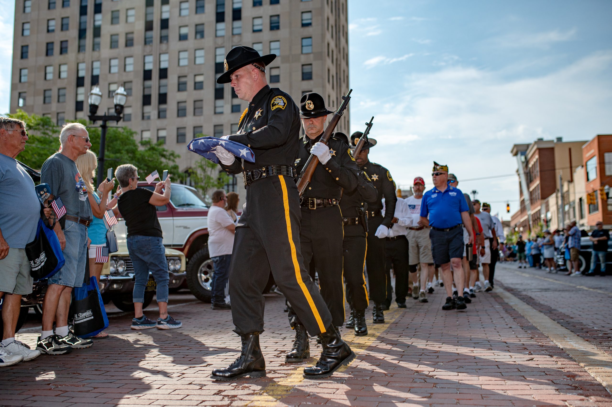 Genesee County Sherriff’s Deputies make their way to Statue Plaza for the Back to the Bricks opening ceremony in Downtown Flint, Mich. on Saturday, Aug. 20, 2022. (Michael Indriolo | Flint Beat)