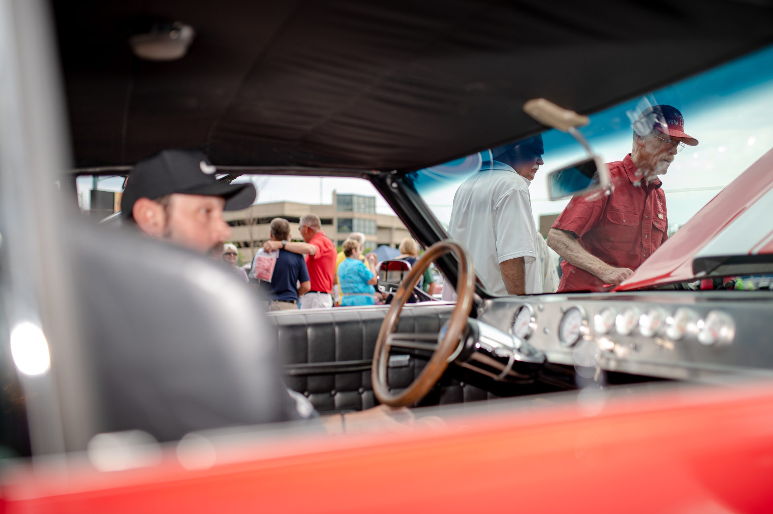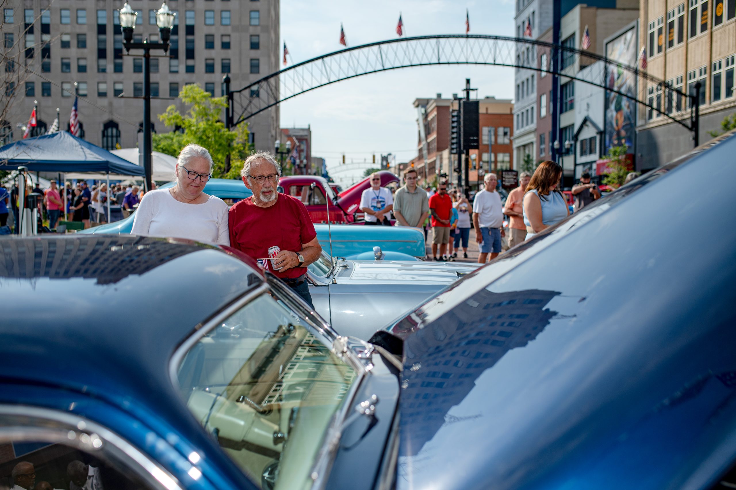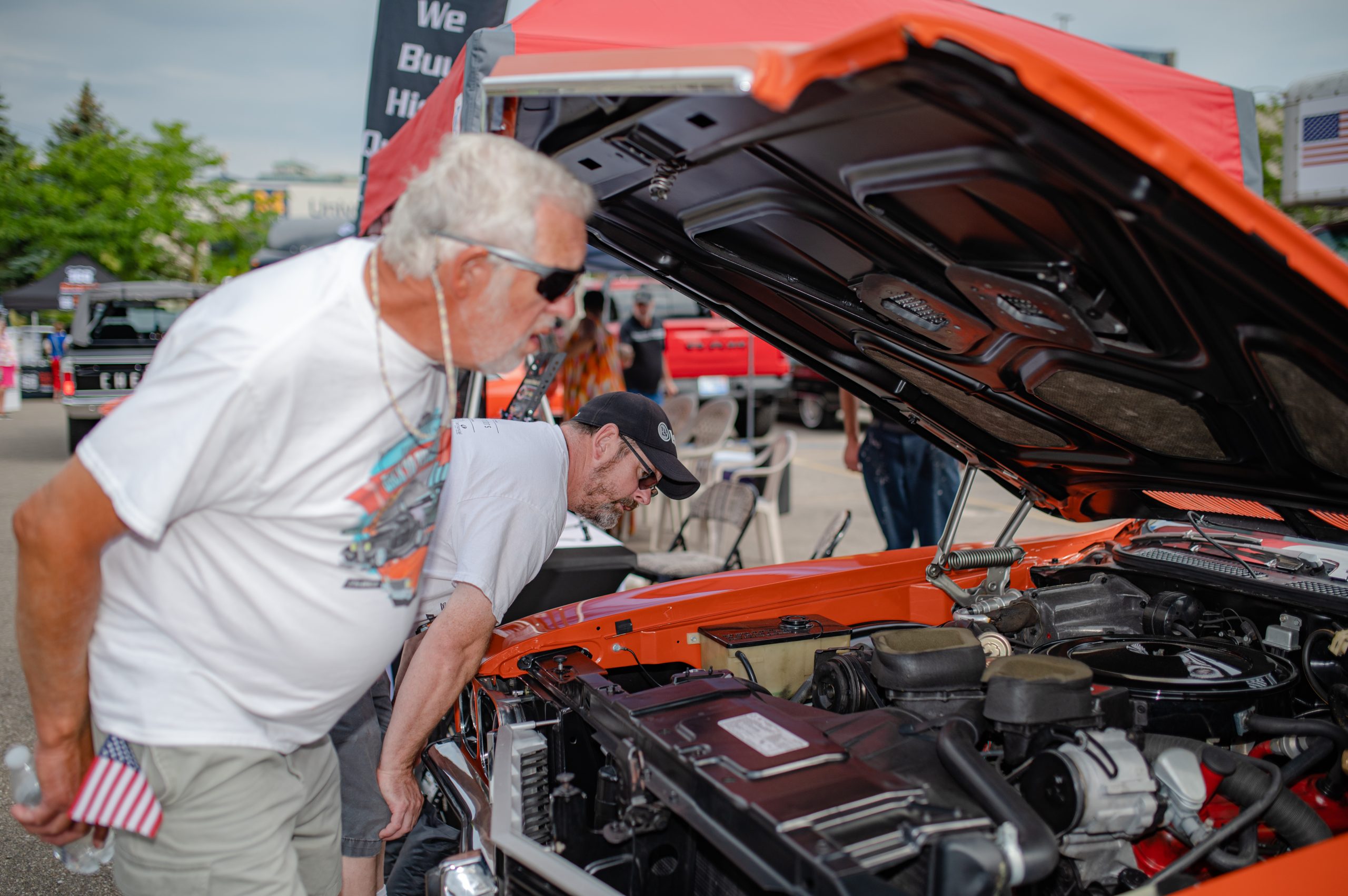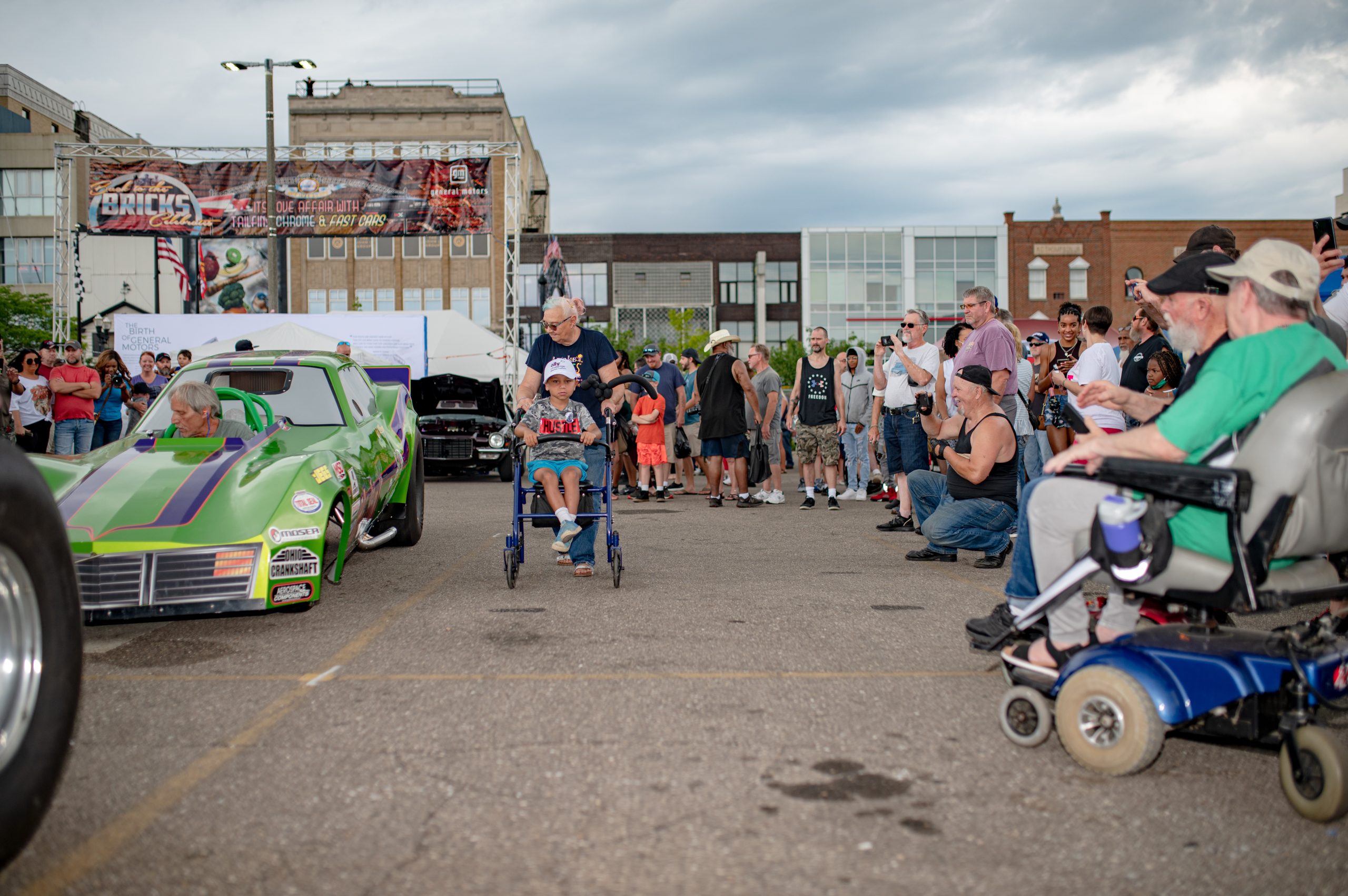 A crowd gathers around to watch Bob Allsop, from Holly, Mich., start up the famed Hi-Jinx race car, which he purchased about a year ago, during Back to the Bricks in Downtown Flint, Mich. on Saturday, Aug. 20, 2022. (Michael Indriolo | Flint Beat)Rob Schroeder starts up his dragster during Back to the Bricks in Downtown Flint, Mich. on Saturday, Aug. 20, 2022. (Michael Indriolo | Flint Beat)A Buick Grand Sport is reflected in the sunglasses of Brendan Van Esley, the engine mechanic at Vanguard Motor Sales, during Back to the Bricks in Downtown Flint, Mich. on Saturday, Aug. 20, 2022. Vanguard restored the Grand Sport. (Michael Indriolo | Flint Beat)Bernie Wise, of Port Clinton, Ohio, and Brad MacDonald, of Oregon, Ohio, check under the hood of a Buick Grand Sport during Back to the Bricks in Downtown Flint, Mich. on Saturday, Aug. 20, 2022. Wise drove his Buick Skylark to the show, and MacDonald drove his Chevrolet Chevelle up. (Michael Indriolo | Flint Beat)