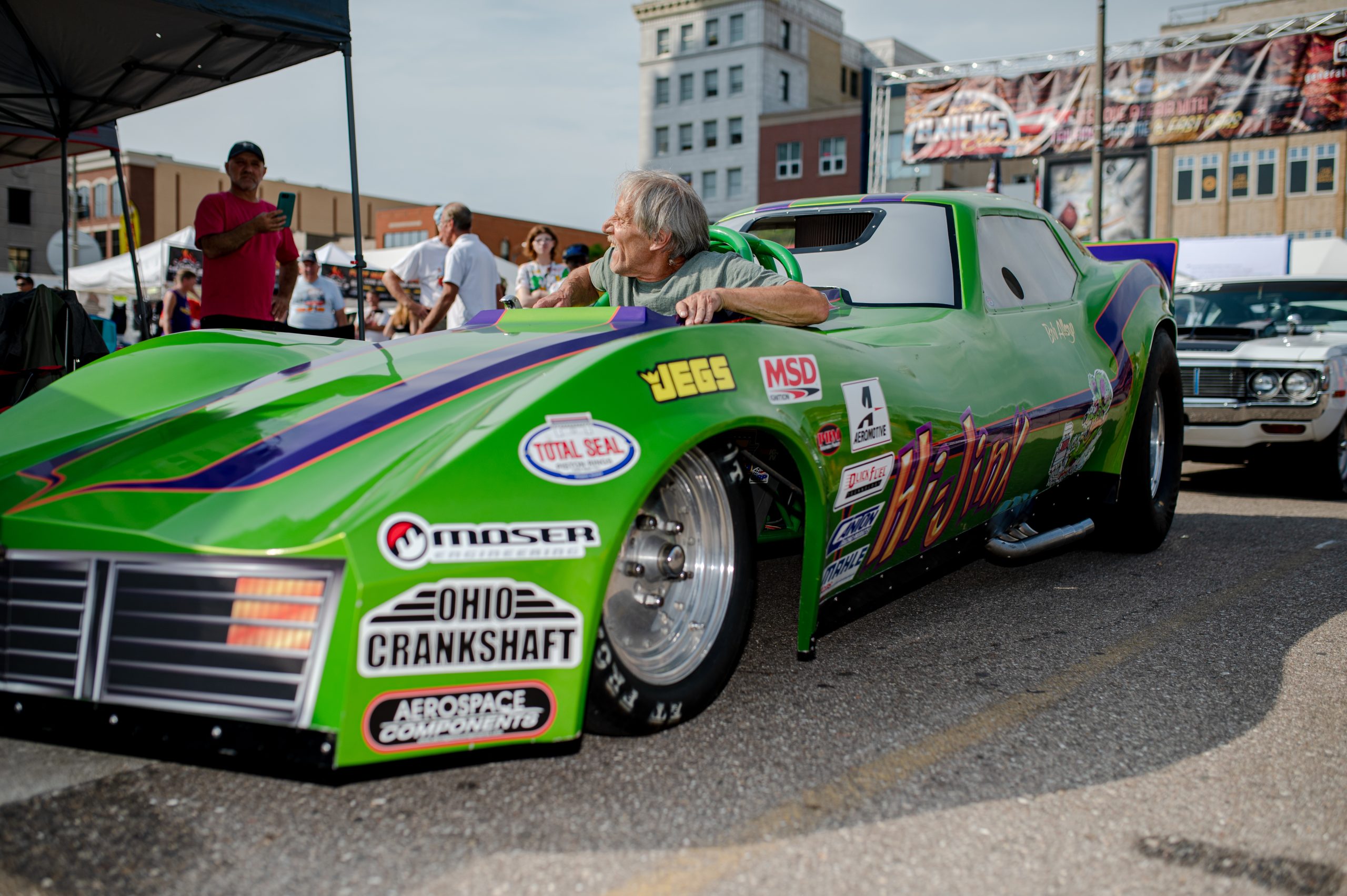 Bob Allsop, from Holly, Mich., climbs out of the famed Hi-Jinx race car, a dragster he acquired about a year ago, after roaring the engine for a crowd gathered around during Back to the Bricks in Downtown Flint, Mich. on Saturday, Aug. 20, 2022. (Michael Indriolo | Flint Beat)