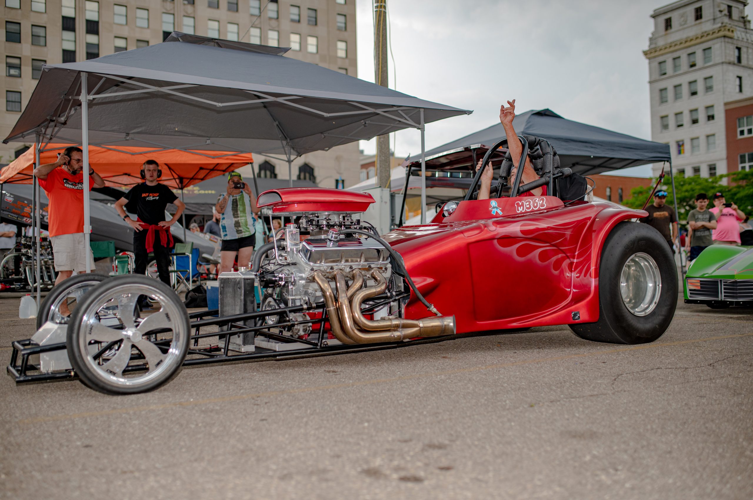 Rob Schroeder, from Davison, Mich., jumps in the front seat of the Easy Money dragster to help the car’s owner, Phil Landram, start it for a crowd gathered around during Back to the Bricks in Downtown Flint, Mich. on Saturday, Aug. 20, 2022. (Michael Indriolo | Flint Beat)