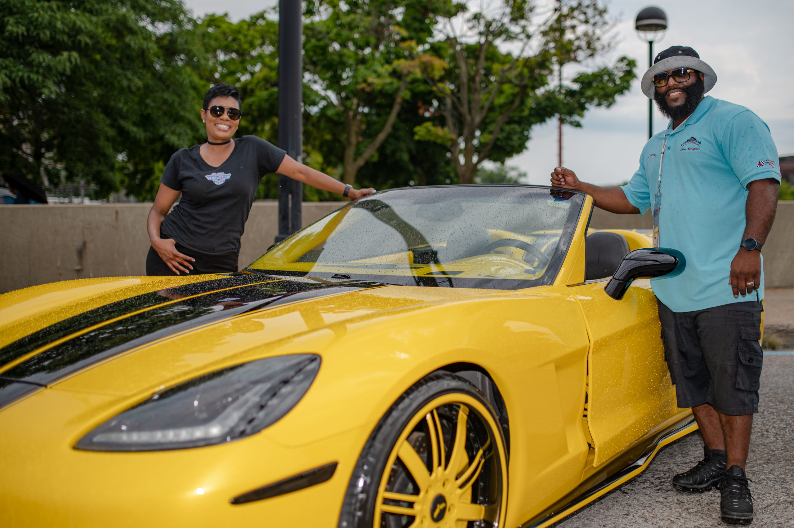 Donta Hampton, president of the Flint-based TrendSettas Corvette Club, and his wife Tammi Hampton, secretary of TrendSettas, pose for a portrait with Donta’s pearl yellow custom Chevrolet Corvette during the Corvette Reunion at Back to the Bricks in Downtown Flint, Mich. on Saturday, Aug. 20, 2022. (Michael Indriolo | Flint Beat)