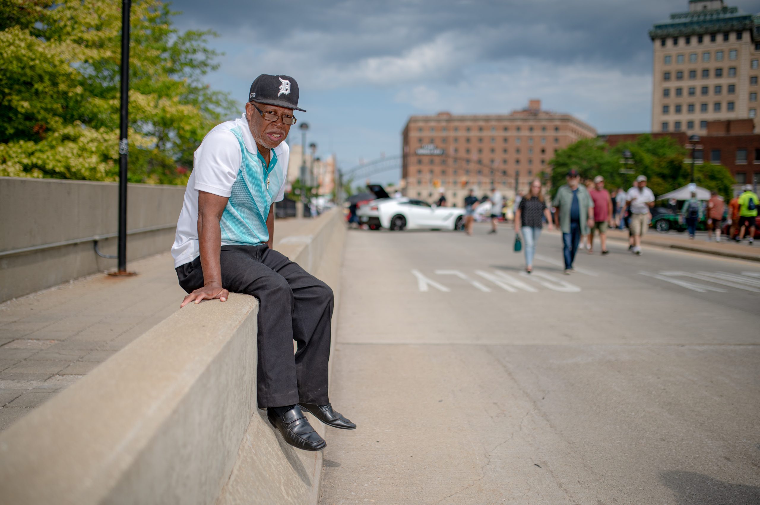 Marvin Horne, a resident of Flint, Mich., rests on a jersey barrier on Saginaw Street during Back to the Bricks in Downtown Flint, Mich. on Saturday, Aug. 20, 2022. Horne spent 39 years working at Flint’s General Motors plant, he said, retiring in 1999. (Michael Indriolo | Flint Beat)