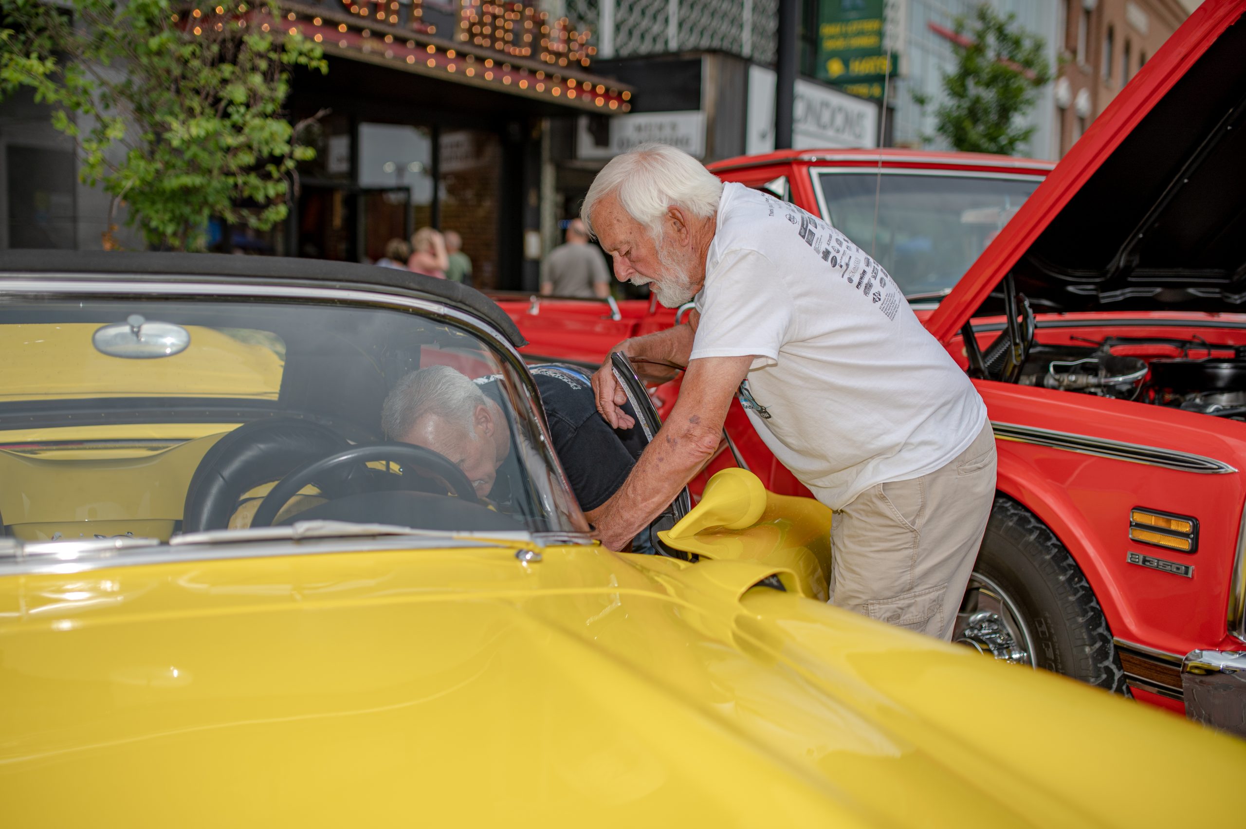 Dwight Polzin, from Fenton, Mich., shows a passerby the interior of his 1957 Chevrolet Corvette during Back to the Bricks in Downtown Flint, Mich. on Saturday, Aug. 20, 2022. Polzin has owned the car for about 25 years, he said.(Michael Indriolo | Flint Beat)