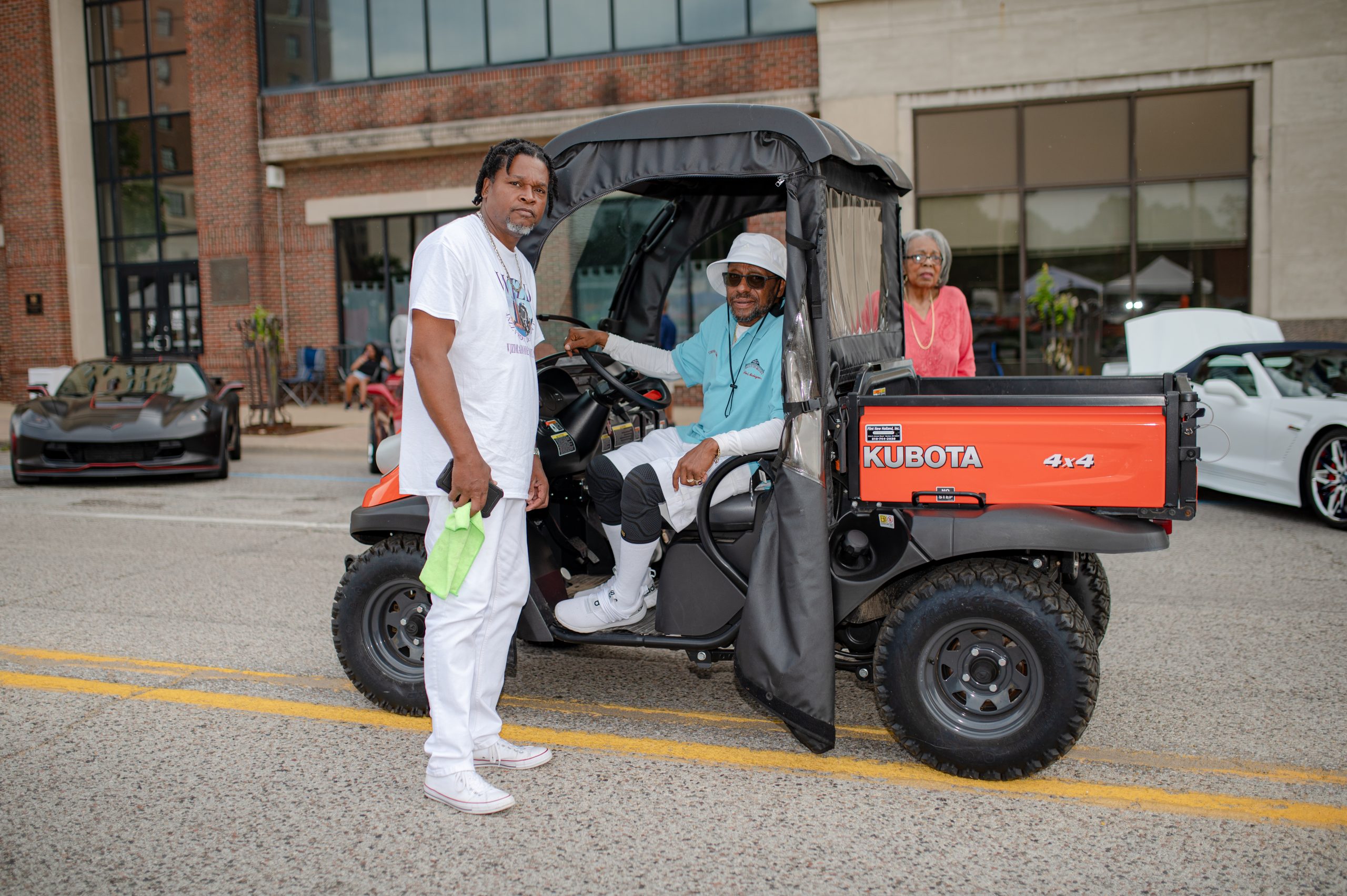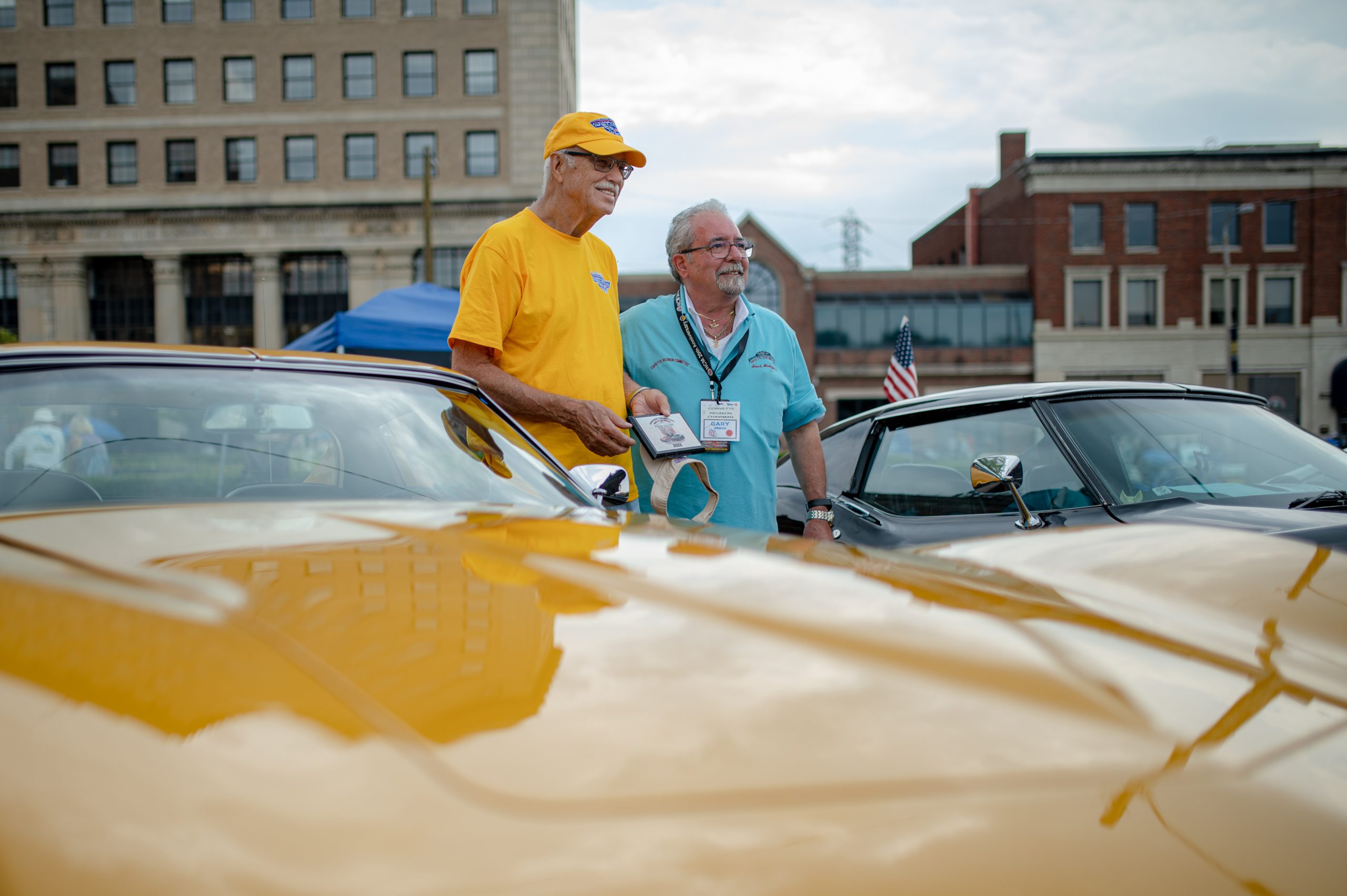 Corvette owners Roger Norton and Wilfred “Nenja” Frelix pose for a photo during the Corvette Reunion at Back to the Bricks in Downtown Flint, Mich. on Saturday, Aug. 20, 2022. (Michael Indriolo | Flint Beat)
