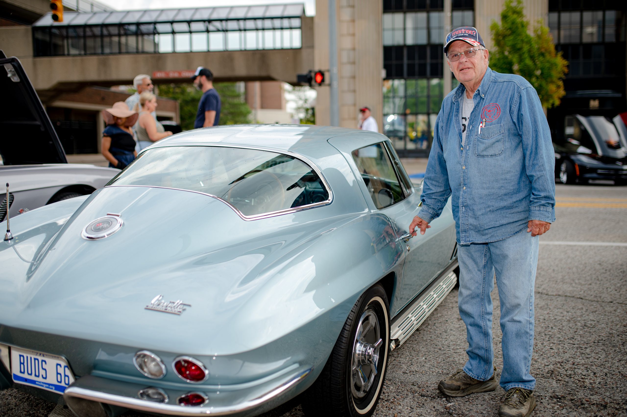 Bud Russell, from Davison, Mich., poses for a photo with his 1966 Chevrolet Corvette Stingray during the Corvette Reunion at Back to the Bricks in Downtown Flint, Mich. on Saturday, Aug. 20, 2022. Russel spent about 10 years restoring his Stingray, and now he drives it with the Flint Corvette Club. (Michael Indriolo | Flint Beat)