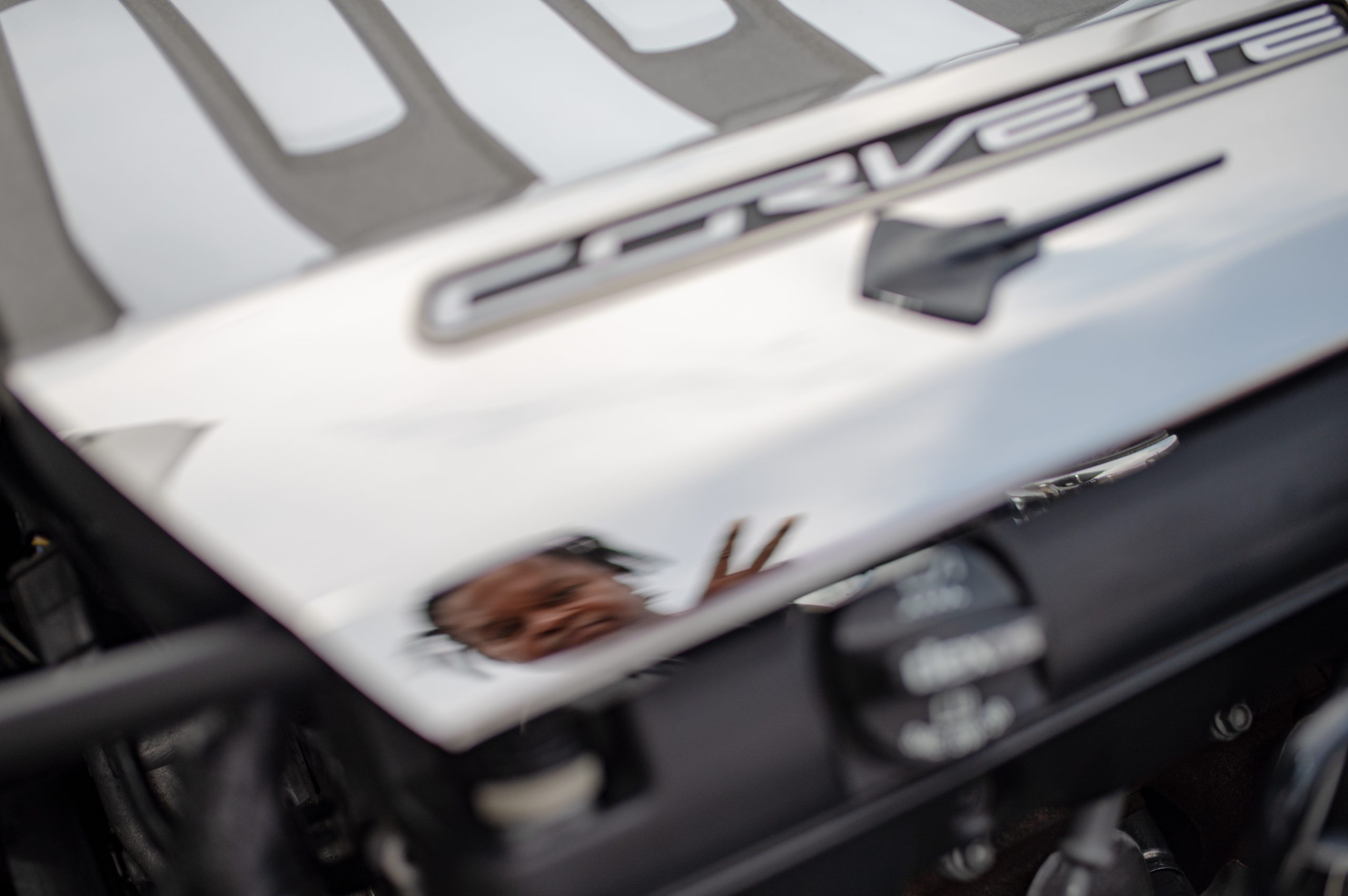 Local musician Wilfred “Nenja” Frelix is reflected in the engine of his 2016 Chevrolet Corvette Twilight Blue during the Corvette Reunion at Back to the Bricks in Downtown Flint, Mich. on Saturday, Aug. 20, 2022. Chevrolet outfitted just 371 Corvettes with the Twilight Blue design package in 2016. (Michael Indriolo | Flint Beat)