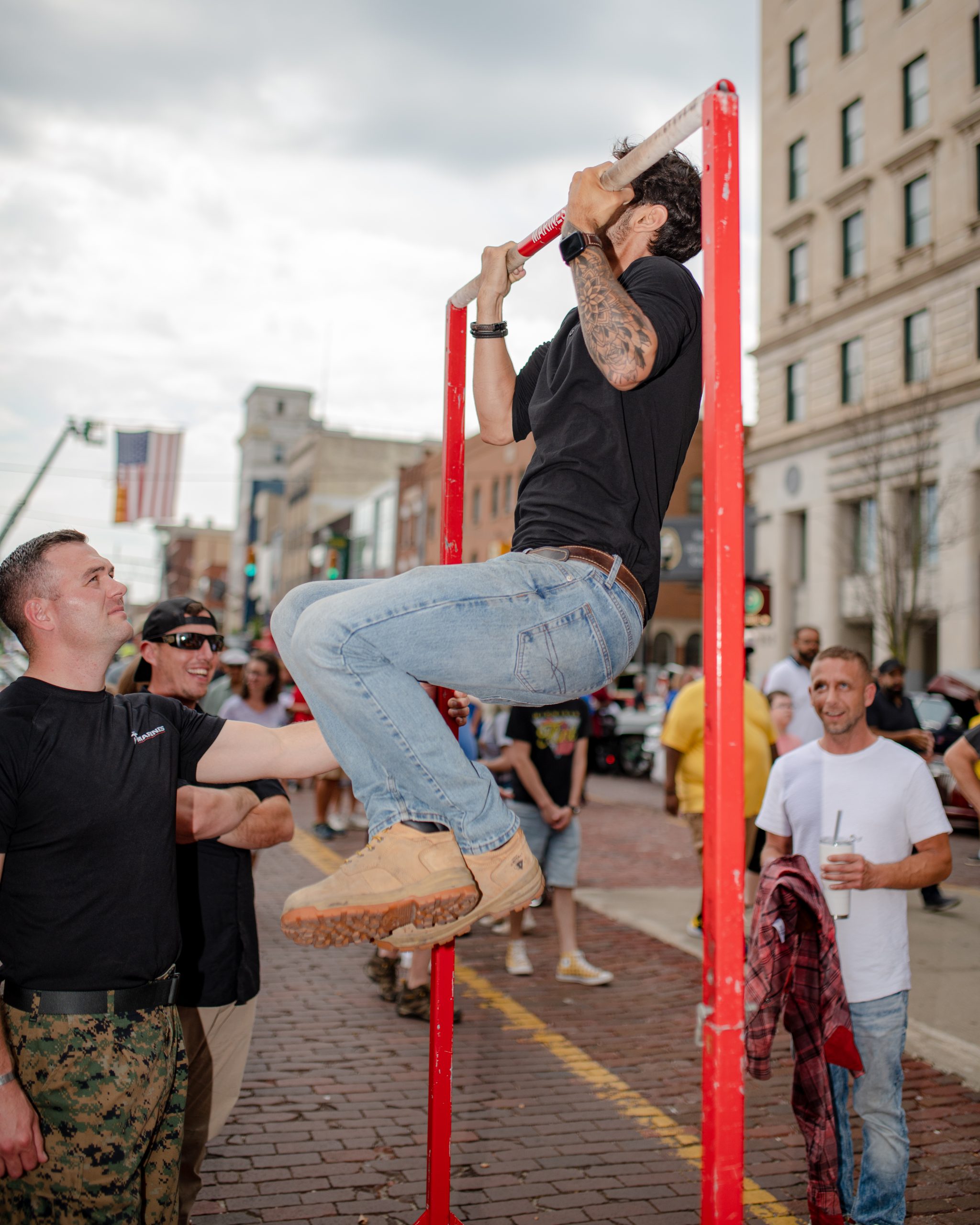 Moe Spooner, from Flint, Mich., performs pull-ups during Back to the Bricks in Downtown Flint, Mich. on Saturday, Aug. 20, 2022. (Michael Indriolo | Flint Beat)
