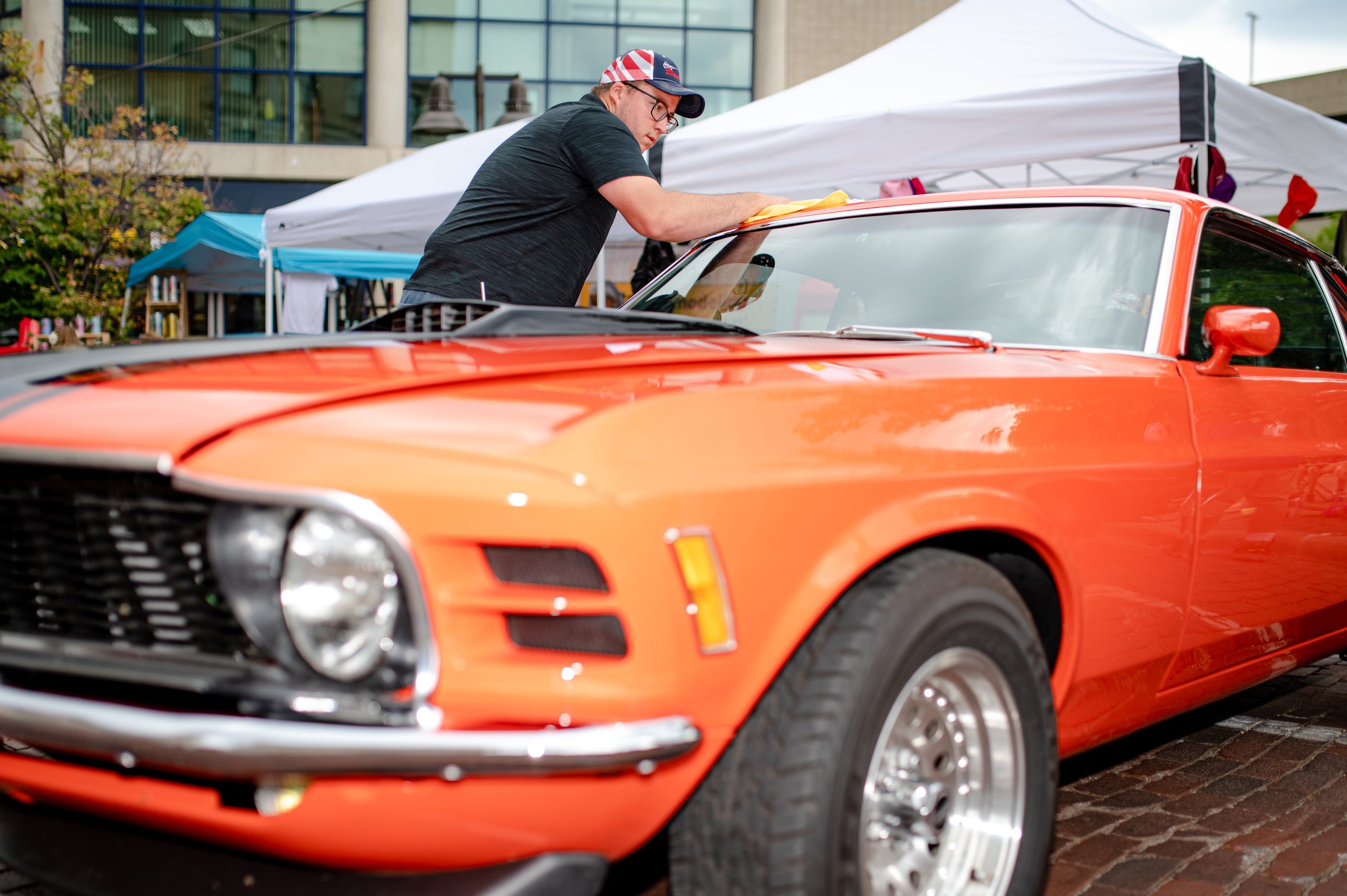 Gabe Thompson, from Mayville, Mich., wipes down his father’s 1970 Ford Mustang during Back to the Bricks in Downtown Flint, Mich. on Saturday, Aug. 20, 2022. Thompson said his father had a scheduling conflict with work, so he drove the car. to the show for him. Thompson’s father restored the car himself, finishing it about a year ago after owning it for about nine years. (Michael Indriolo | Flint Beat)