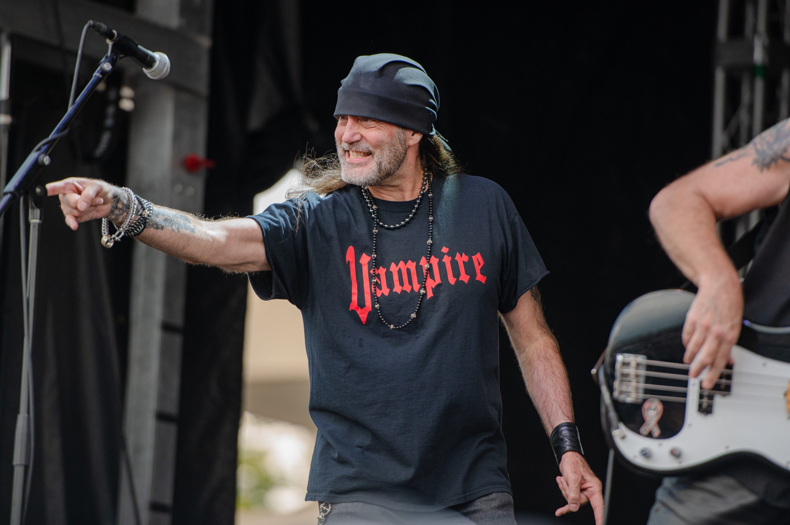 Lead singer Danny “The Count” Koker, of Count’s 77, points to an audience member during Back to the Bricks in Downtown Flint, Mich. on Saturday, Aug. 20, 2022. Koker, who grew up partly in Detroit, also starred in the History Channel reality TV show “Counting Cars,” which follows the day-to-day operations of his vehicle restoration garage Count’s Customs in Las Vegas. (Michael Indriolo | Flint Beat)