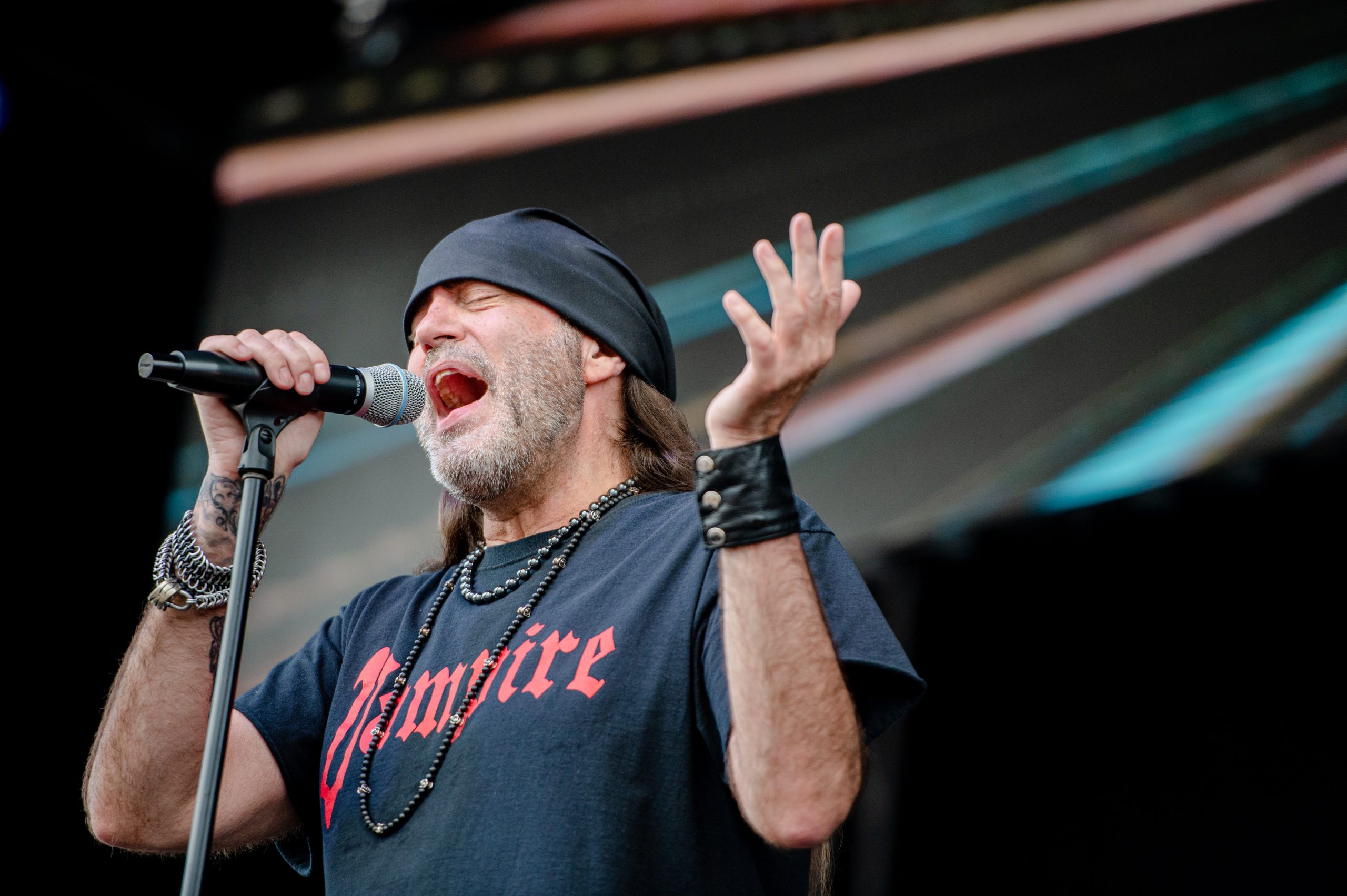 Lead singer Danny “The Count” Koker, of Count’s 77, sings during Back to the Bricks in Downtown Flint, Mich. on Saturday, Aug. 20, 2022. Koker, who grew up partly in Detroit, also starred in the History Channel reality TV show “Counting Cars,” which follows the day-to-day operations of his vehicle restoration garage Count’s Customs in Las Vegas. (Michael Indriolo | Flint Beat)
