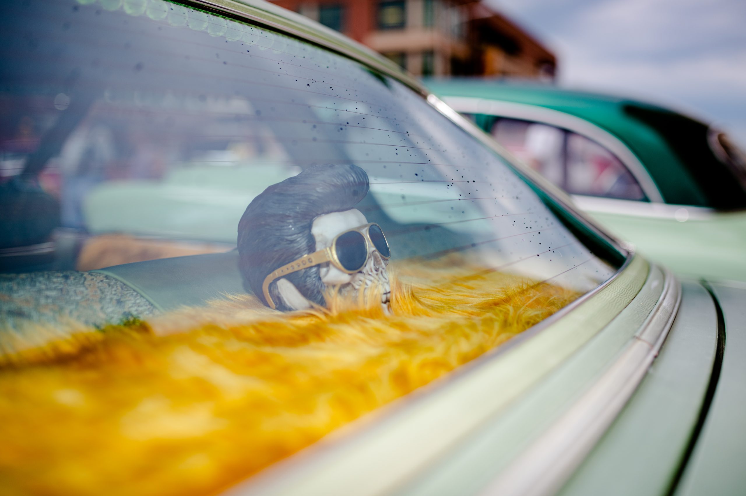 A decorative Elvis skull rests in the rear deck of a car during Back to the Bricks in Downtown Flint, Mich. on Saturday, Aug. 20, 2022. (Michael Indriolo | Flint Beat)