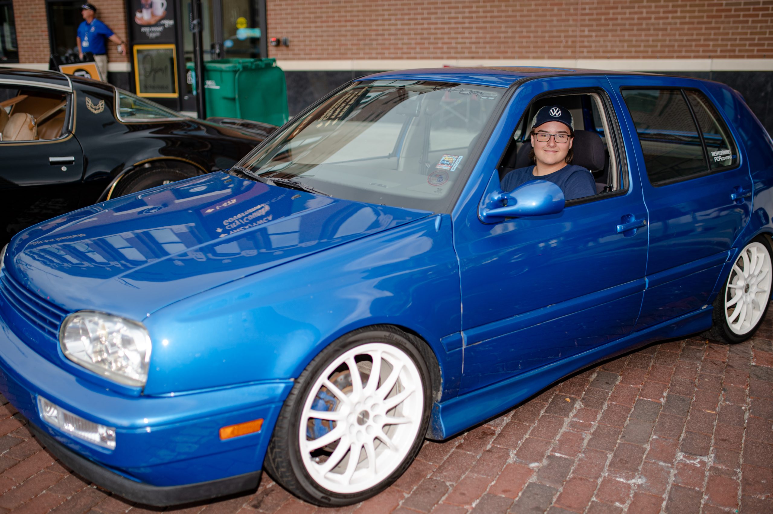 Mitchell Lenger, from Flushing, Mich., poses for a photo in his 1995 Volkswagen Golf, which he inherited from his father, during Back to the Bricks in Downtown Flint, Mich. on Saturday, Aug. 20, 2022. Lenger’s father bought the car in 2002, and he brought it to Back to the Bricks, he said, because there weren’t many German cars at the show. (Michael Indriolo | Flint Beat)