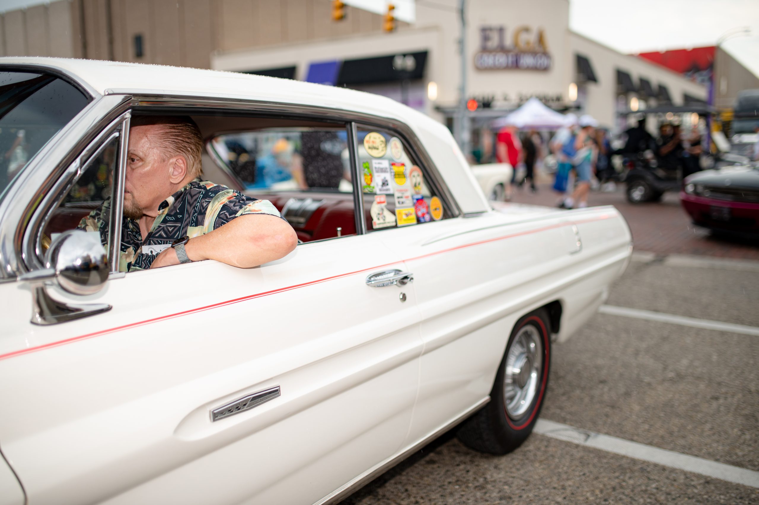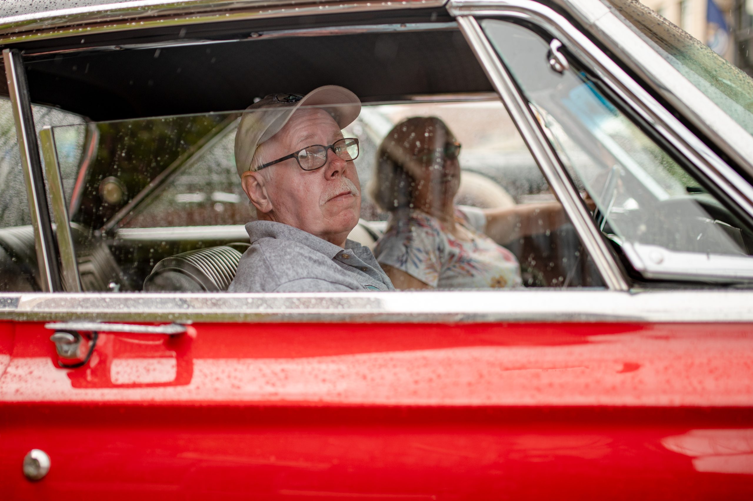 A car show attendee drives down Second Street as heavy rain begins to fall during Back to the Bricks in Downtown Flint, Mich. on Saturday, Aug. 20, 2022. (Michael Indriolo | Flint Beat)Phillip Allinger, of All Automotive in Burton, Mich., closes the doors of his Ford Model A as heavy rain begins to fall during Back to the Bricks in Downtown Flint, Mich. on Saturday, Aug. 20, 2022. (Michael Indriolo | Flint Beat)Dennis and Vickie Oleksiak rest in Oleksiak’s 1965 Plymouth Satellite as heavy rain falls during Back to the Bricks in Downtown Flint, Mich. on Saturday, Aug. 20, 2022. (Michael Indriolo | Flint Beat)