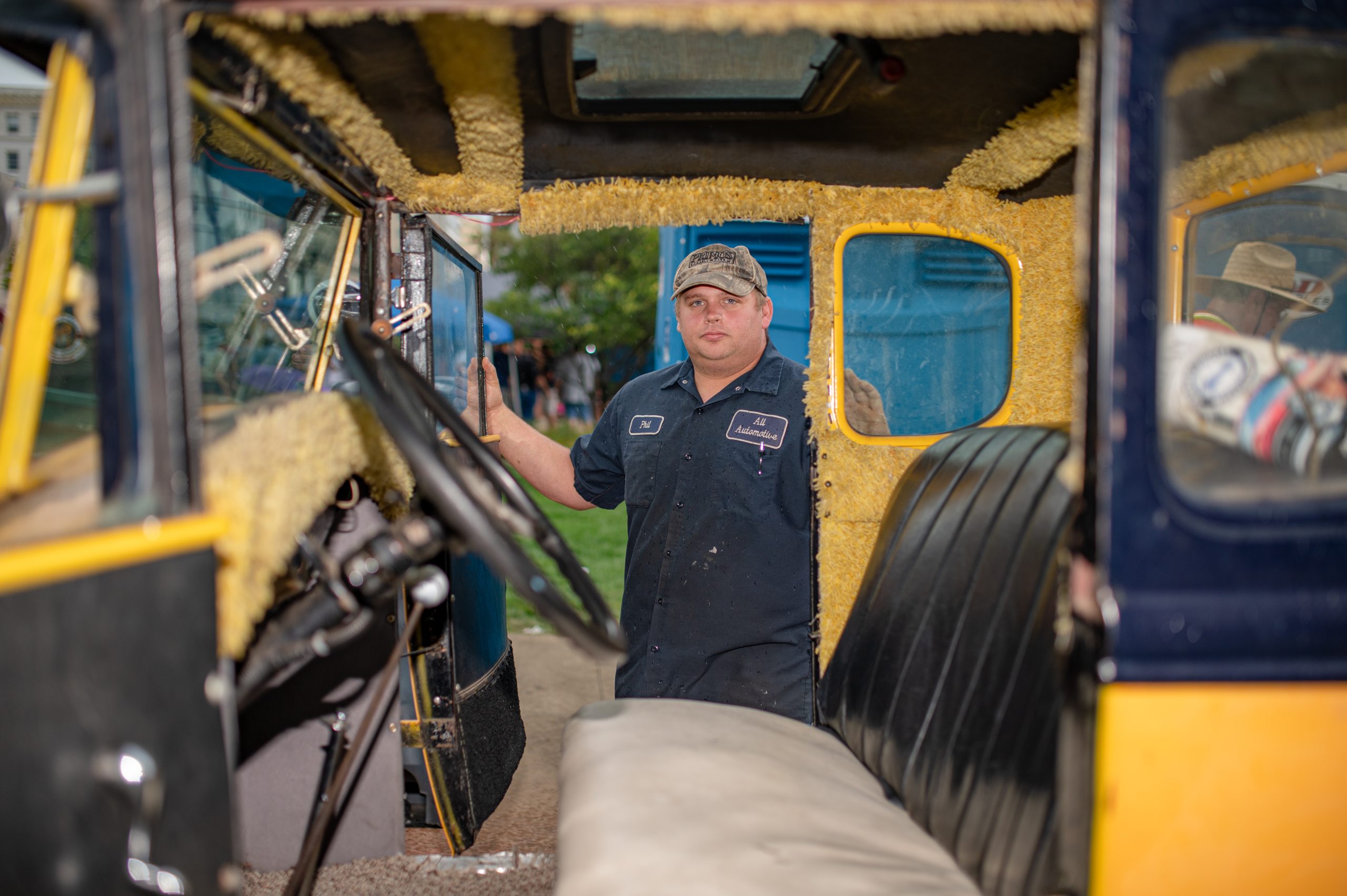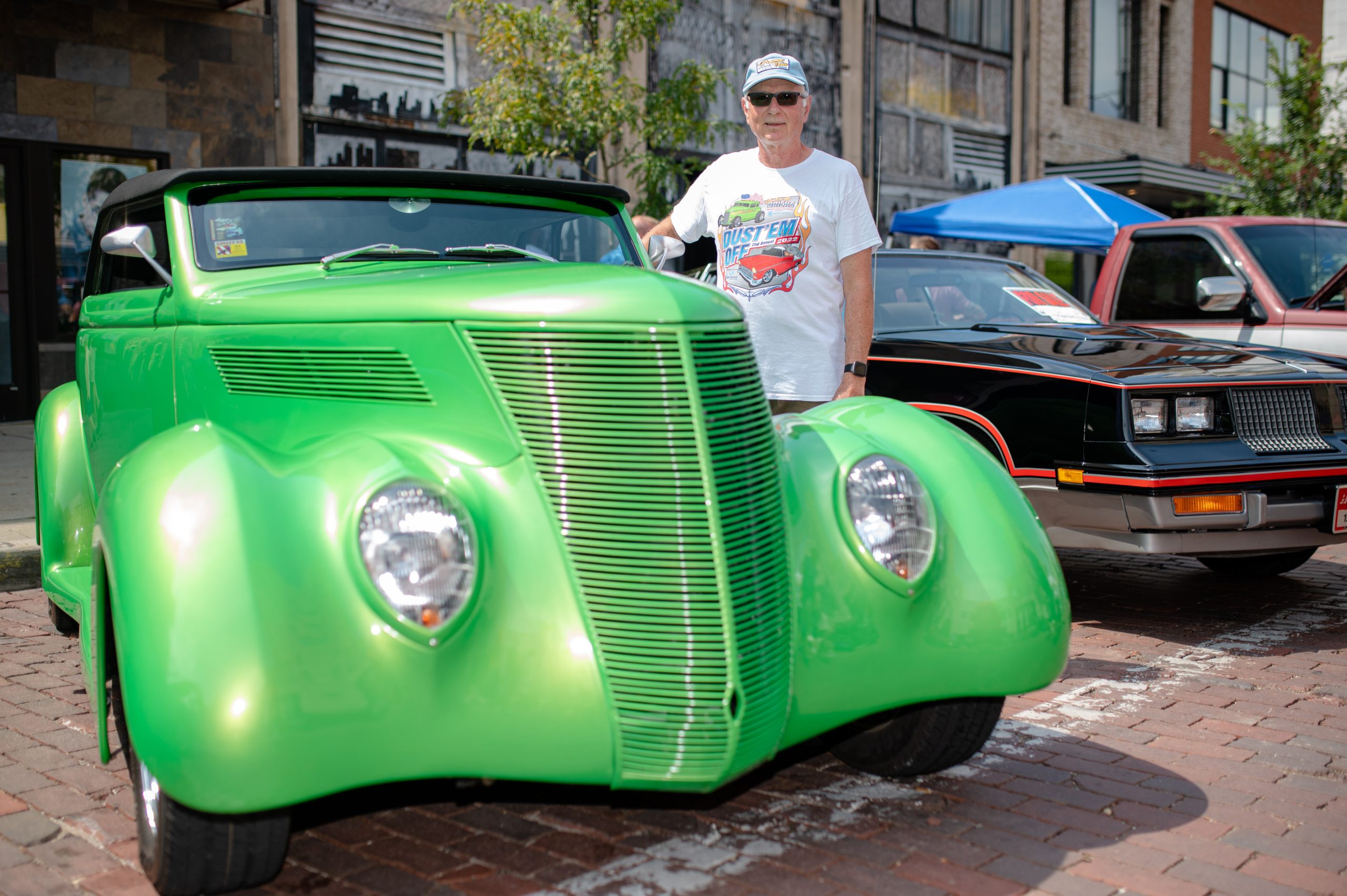 Norton Stadler, from Clio, Mich., poses for a photo with his 1937 Ford Club Cabriolet during Back to the Brick in Downtown Flint, Mich. on Saturday, Aug. 20, 2022. Stadler spent about six years restoring the car himself, he said, completely redoing the interior and modifying the body to fit his vision. He began restoring it about 11 years ago, he’s driven it to car shows across the U.S. (Michael Indriolo | Flint Beat)
