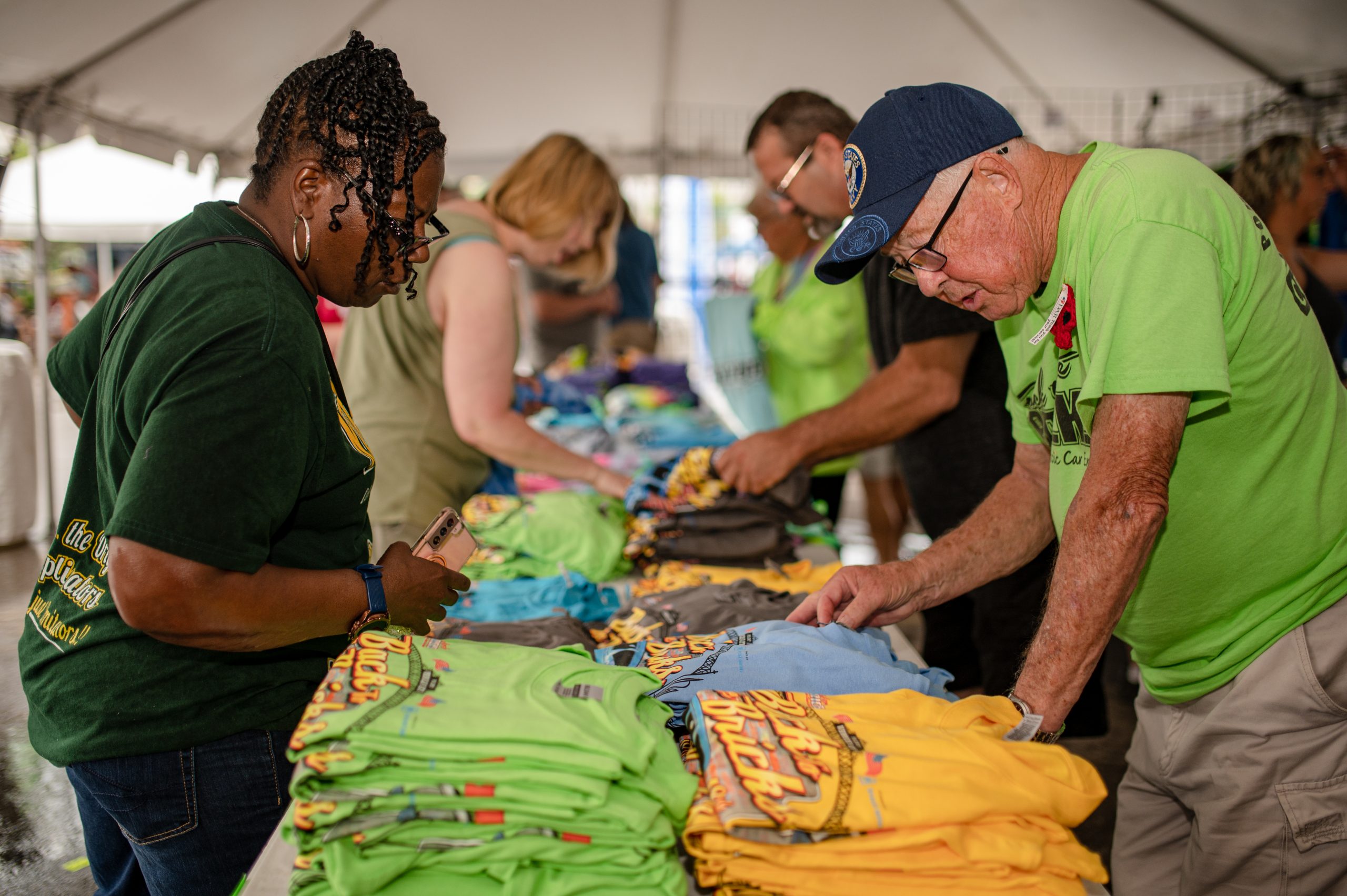 Douglas Smith helps Cheryl Jackson pick out a commemorative shirt during Back to the Bricks in Downtown Flint, Mich. on Saturday, Aug. 20, 2022. (Michael Indriolo | Flint Beat)