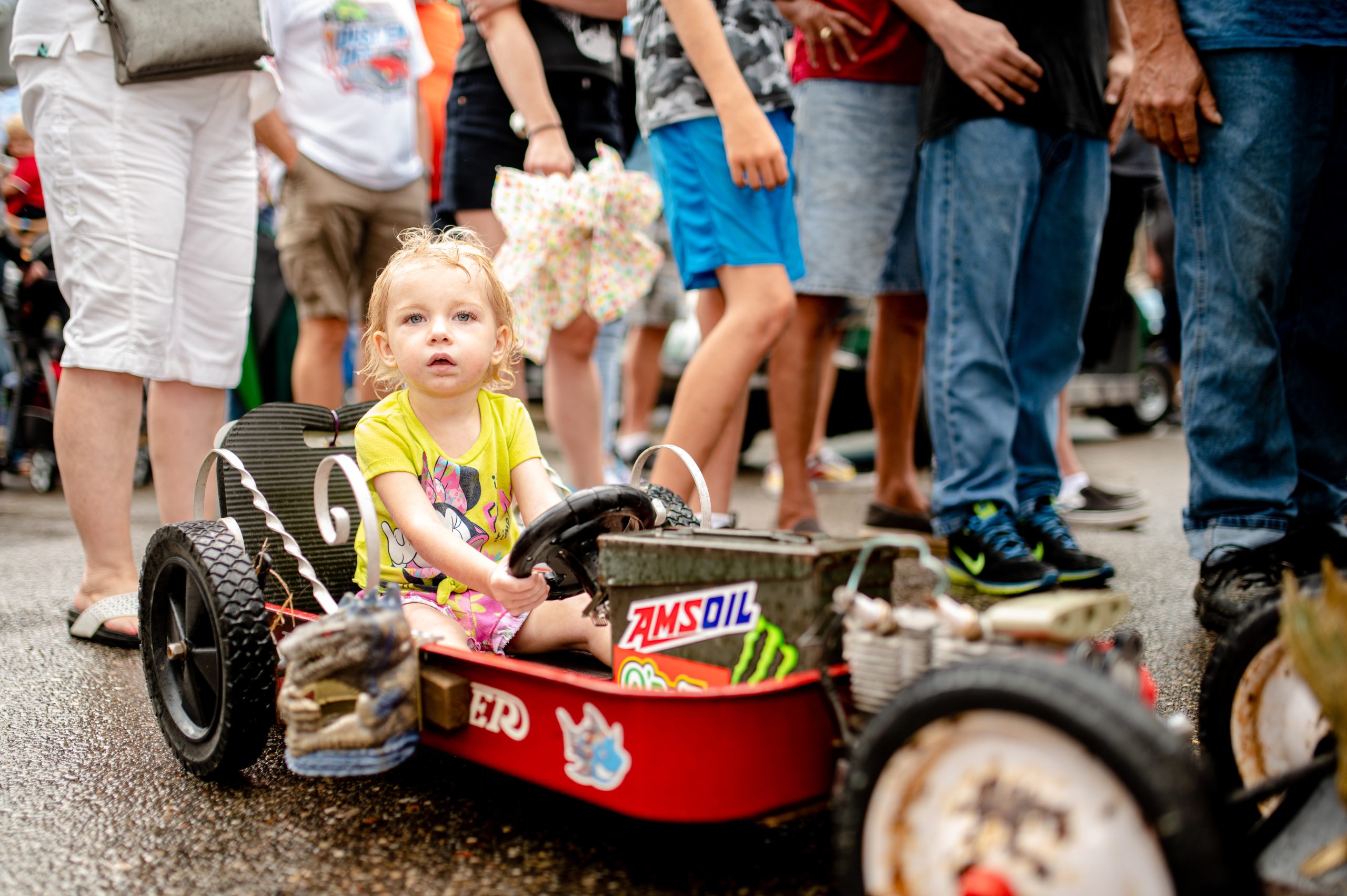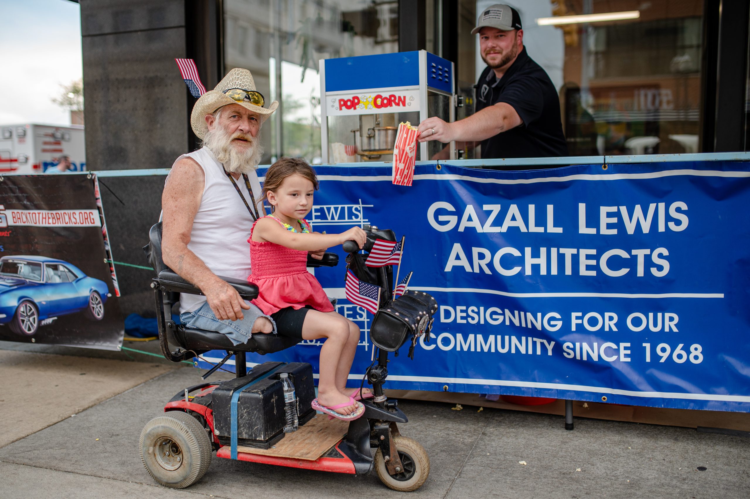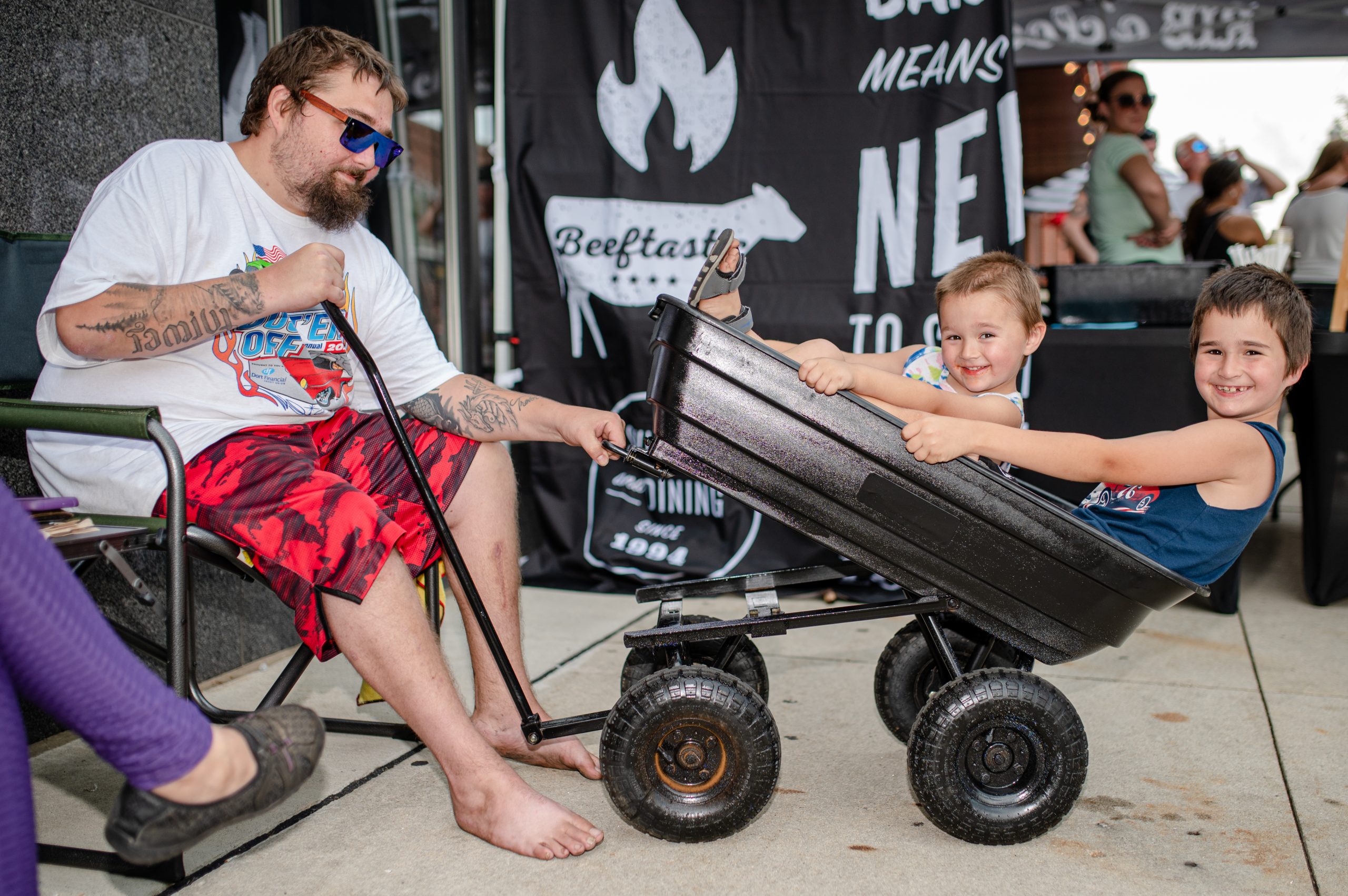 Anthony Floria and Clae Floria pose for a photo after asking Spencer Floria to tip their wagon during Back to the Bricks in Downtown Flint, Mich. on Saturday, Aug. 20, 2022. (Michael Indriolo | Flint Beat)