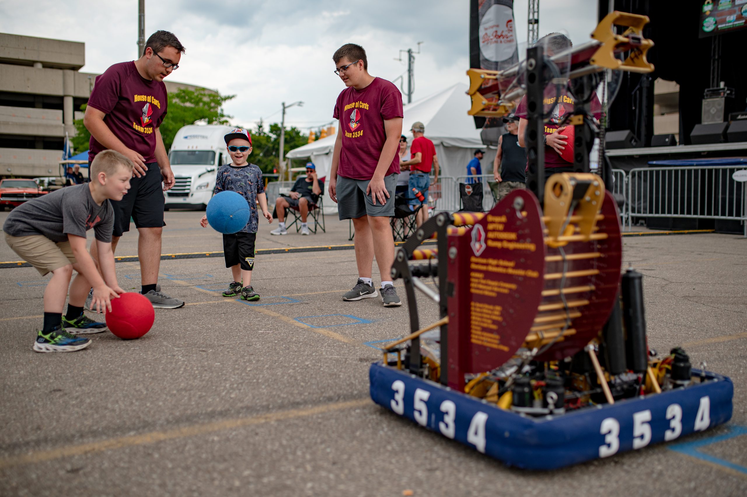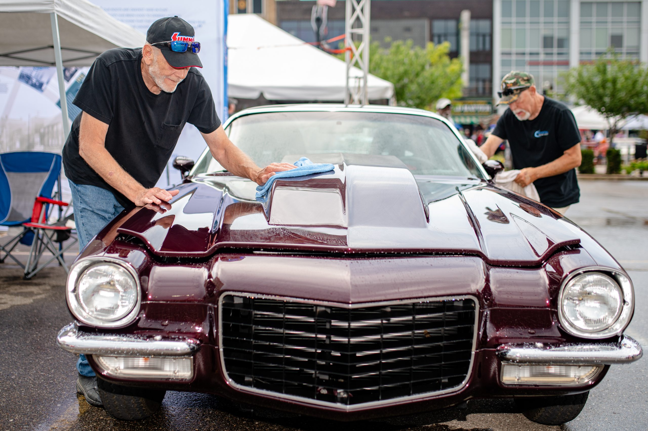 Aliza Mills, from Owosso, Mich., waits in line for a free commemorative shirt during Back to the Bricks in Downtown Flint, Mich. on Saturday, Aug. 20, 2022. (Michael Indriolo | Flint Beat)Lane Stebbins, from Flint, Mich., moves to catch a ball thrown by a ball-tossing robot created by the Davison High School robotics club, also known as House of Cards, during Back to the Bricks in Downtown Flint, Mich. on Saturday, Aug. 20, 2022. (Michael Indriolo | Flint Beat)Bob Smith and Bill Harris, both from Flint, Mich., wipe down Smith’s 1973 Chevrolet Camaro after heavy rain fell during Back to the Bricks in Downtown Flint, Mich. on Saturday, Aug. 20, 2022. (Michael Indriolo | Flint Beat)