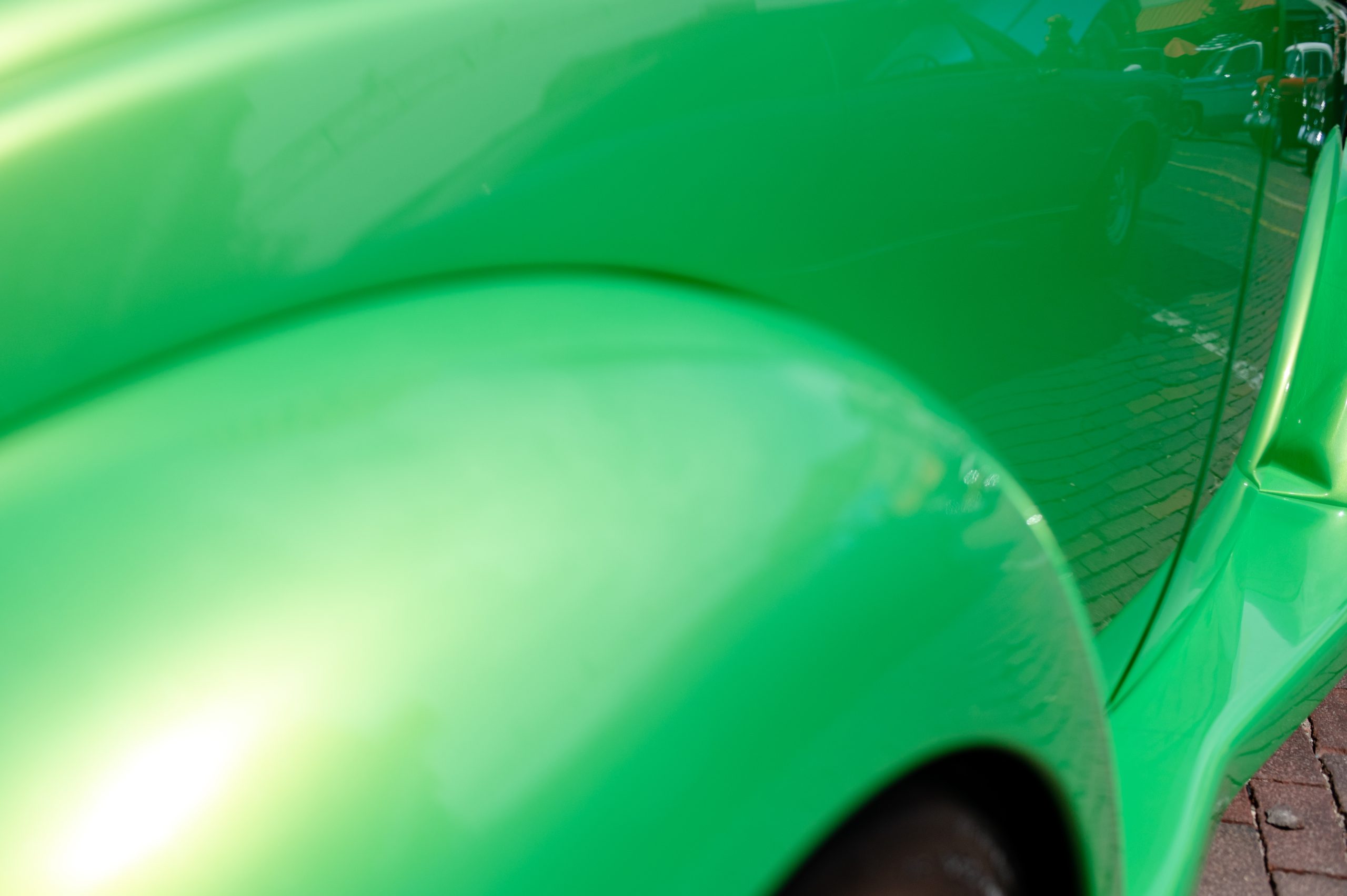 The sky is reflected in Ron Prevett’s 1994 Chevrolet Corvette during the Corvette Reunion at Back to the Bricks in Downtown Flint, Mich. on Saturday, Aug. 20, 2022. (Michael Indriolo | Flint Beat)