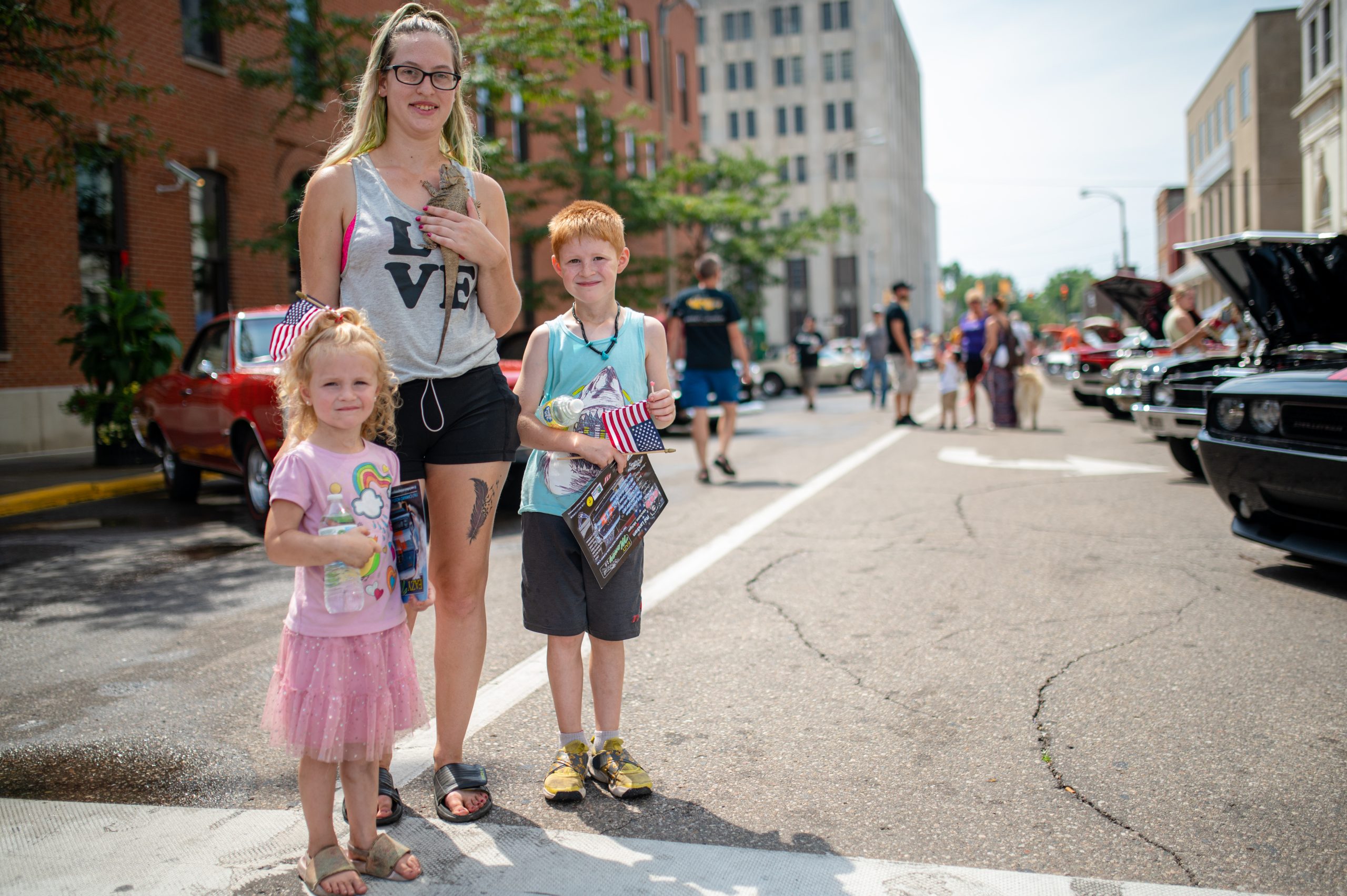 Kailee Olds holds her bearded dragon Big Mama while posing for a photo with Zoey Hect and Hunter Hect during Back to the Bricks in Downtown Flint, Mich. on Saturday, Aug. 20, 2022. (Michael Indriolo | Flint Beat)