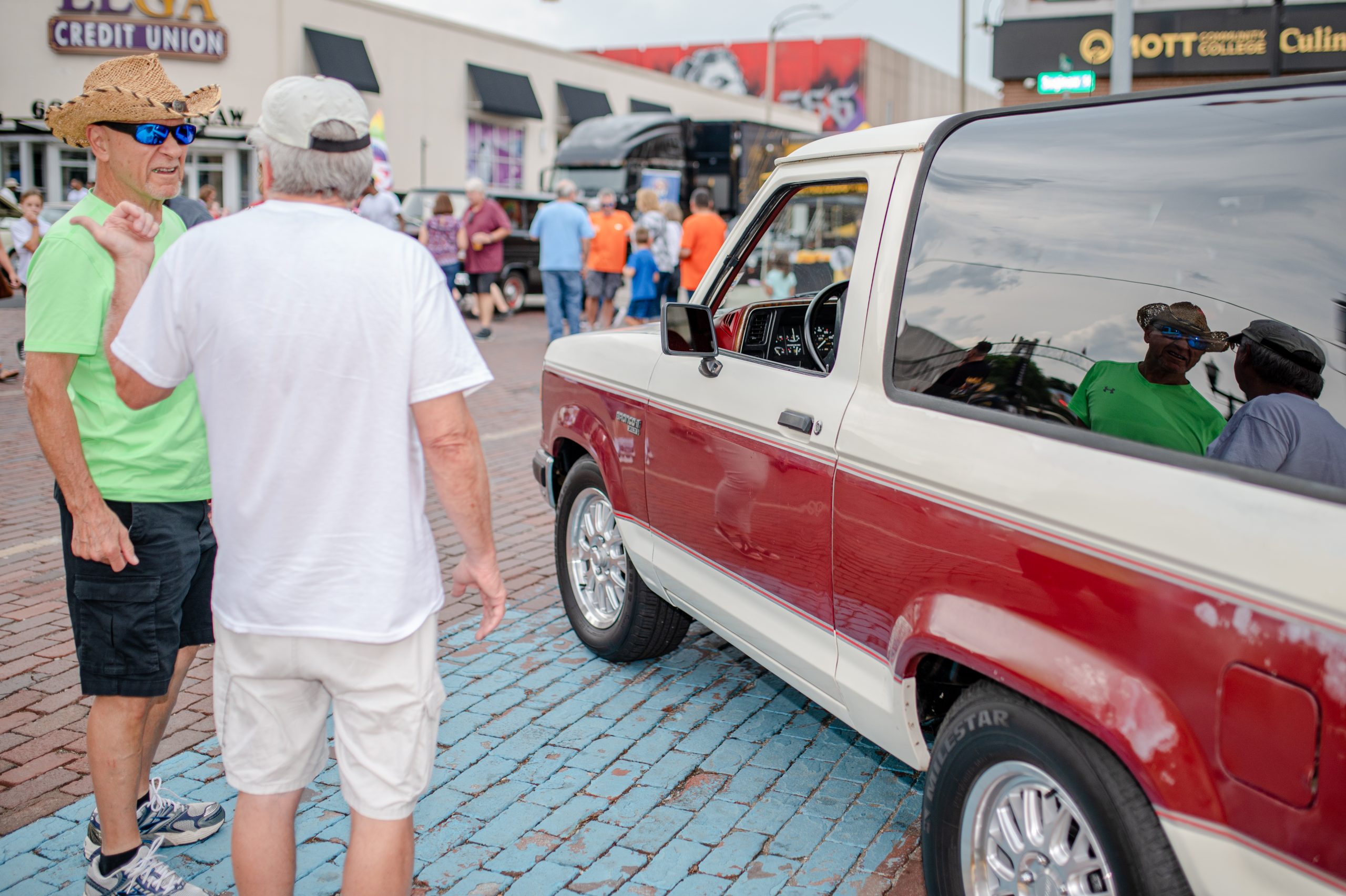 Tom Rhodes tells Joe about his 1989 Ford Bronco II during Back to the Bricks in Downtown Flint, Mich. on Saturday, Aug. 20, 2022. (Michael Indriolo | Flint Beat)