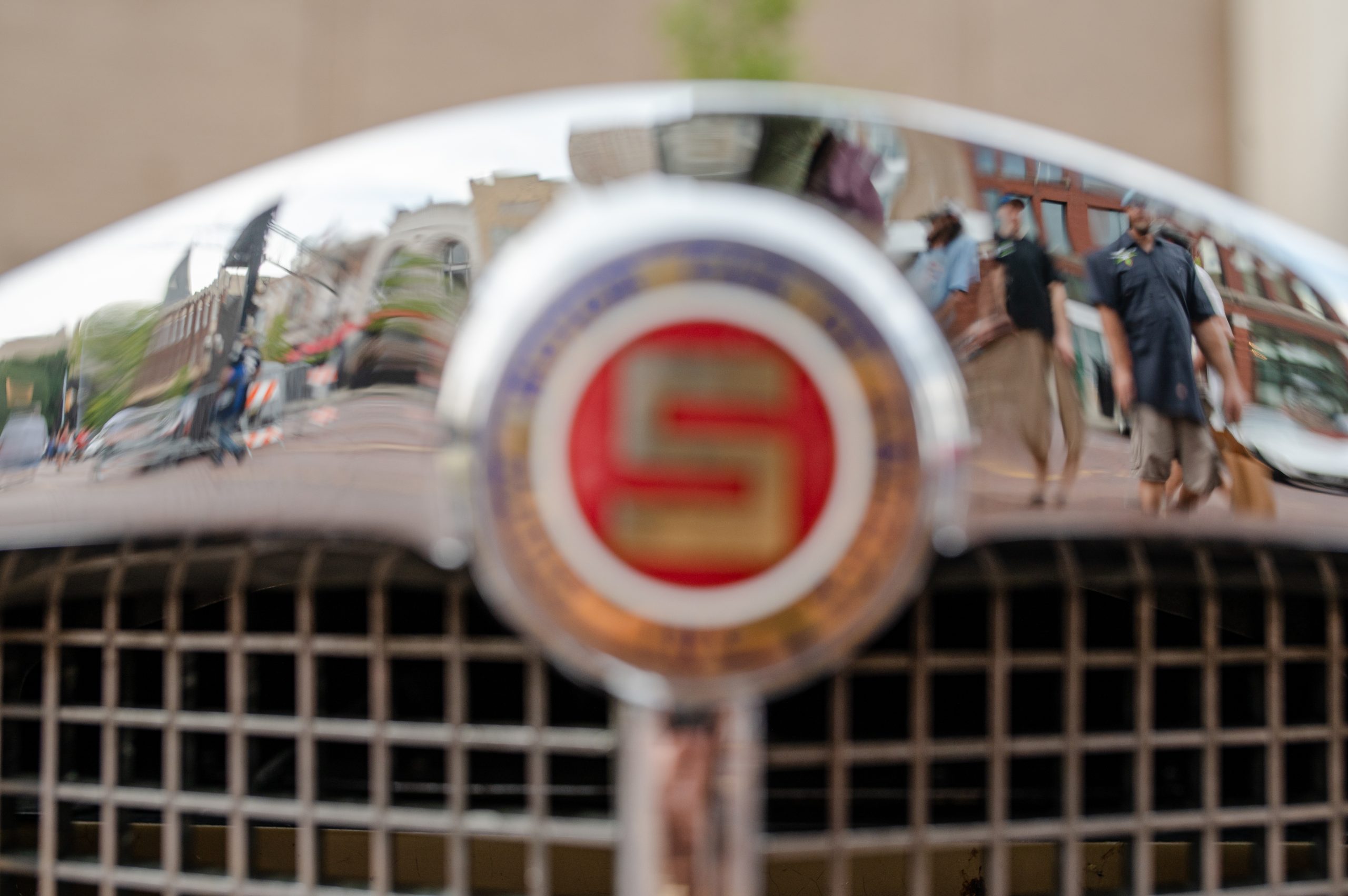 Car enthusiasts are reflected in the grill of John Will’s 1979 Stutz Bearcat during Back to the Bricks in Downtown Flint, Mich. on Saturday, Aug. 20, 2022. (Michael Indriolo | Flint Beat)