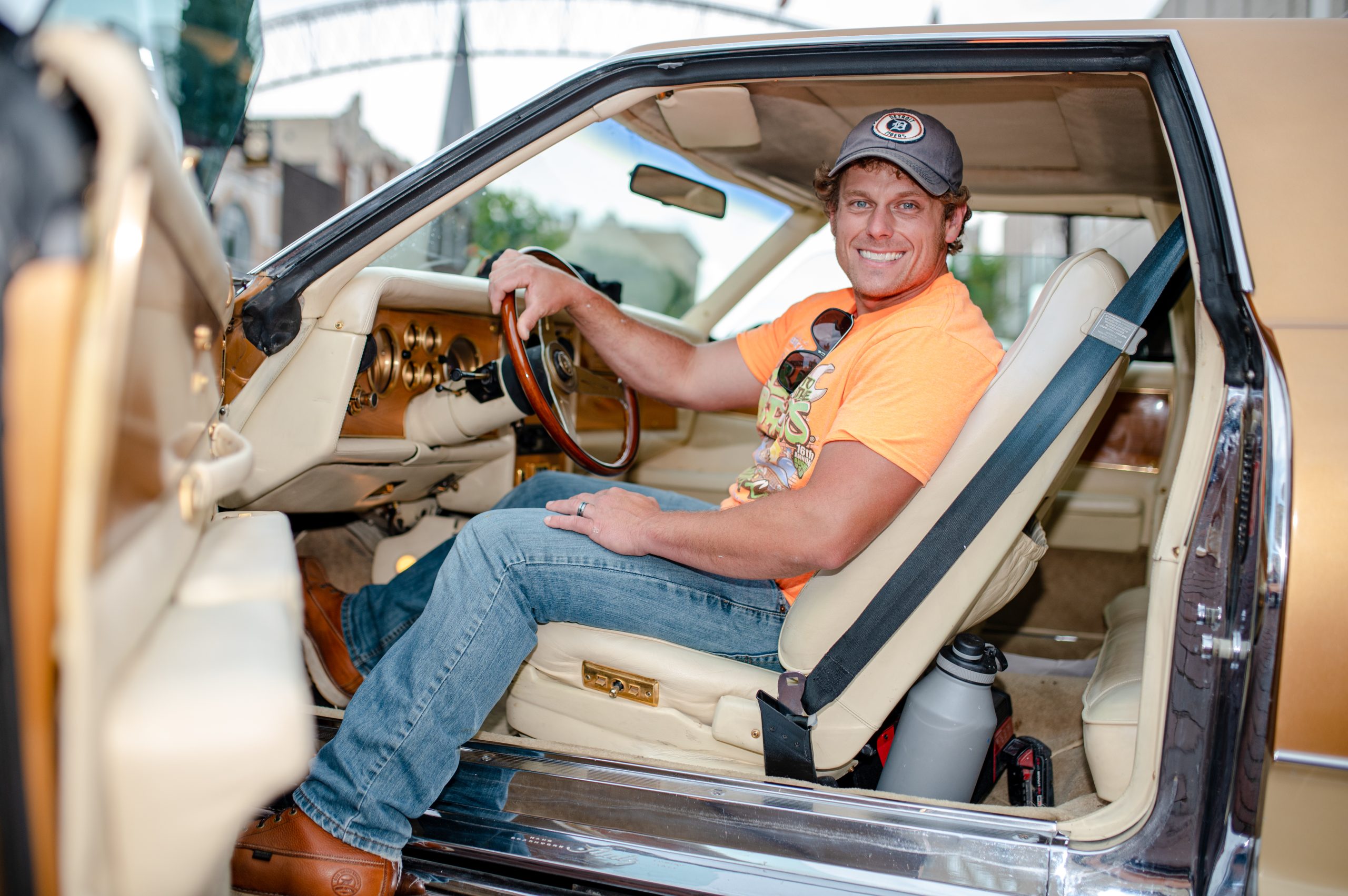 John Will, a self described “Flint-stone to the bone,” poses for a photo in the 1979 Stutz Bearcat that he inherited from his father during Back to the Bricks in Downtown Flint, Mich. on Saturday, Aug. 20, 2022. (Michael Indriolo | Flint Beat)