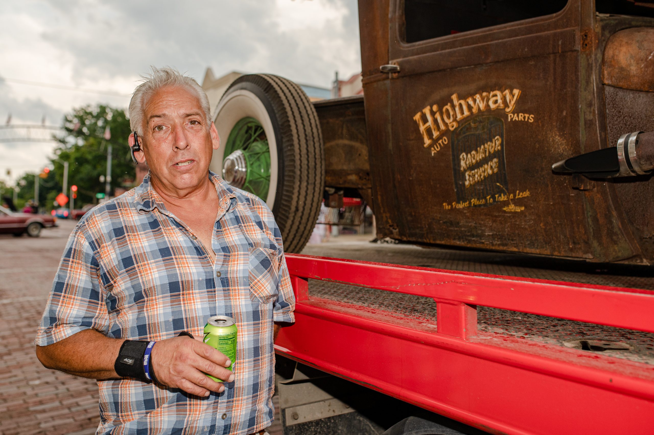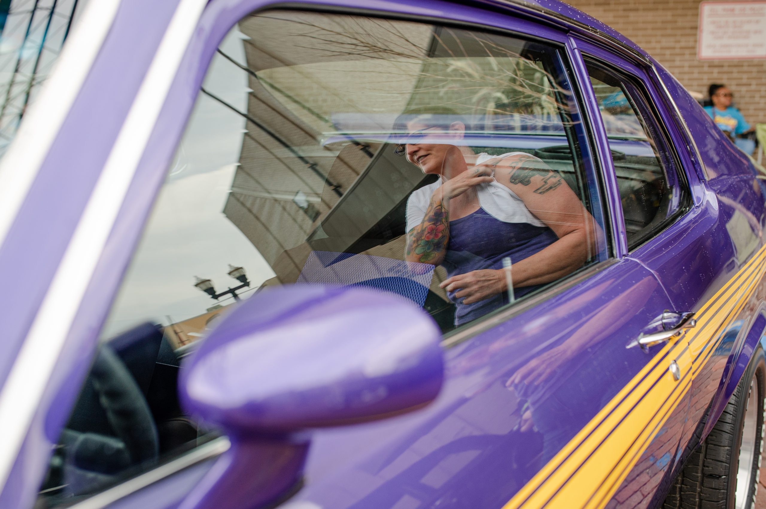 Ronna Kulongowski shows the tattoo of her 1973 Chevrolet Nova, which she’s owned for about 13 years, in the reflection of the car’s window during Back to the Bricks in Downtown Flint, Mich. on Saturday, Aug. 20, 2022. (Michael Indriolo | Flint Beat)Randy Lewicki, of Highway Auto Parts, poses for a photo during Back to the Bricks in Downtown Flint, Mich. on Saturday, Aug. 20, 2022. (Michael Indriolo | Flint Beat)