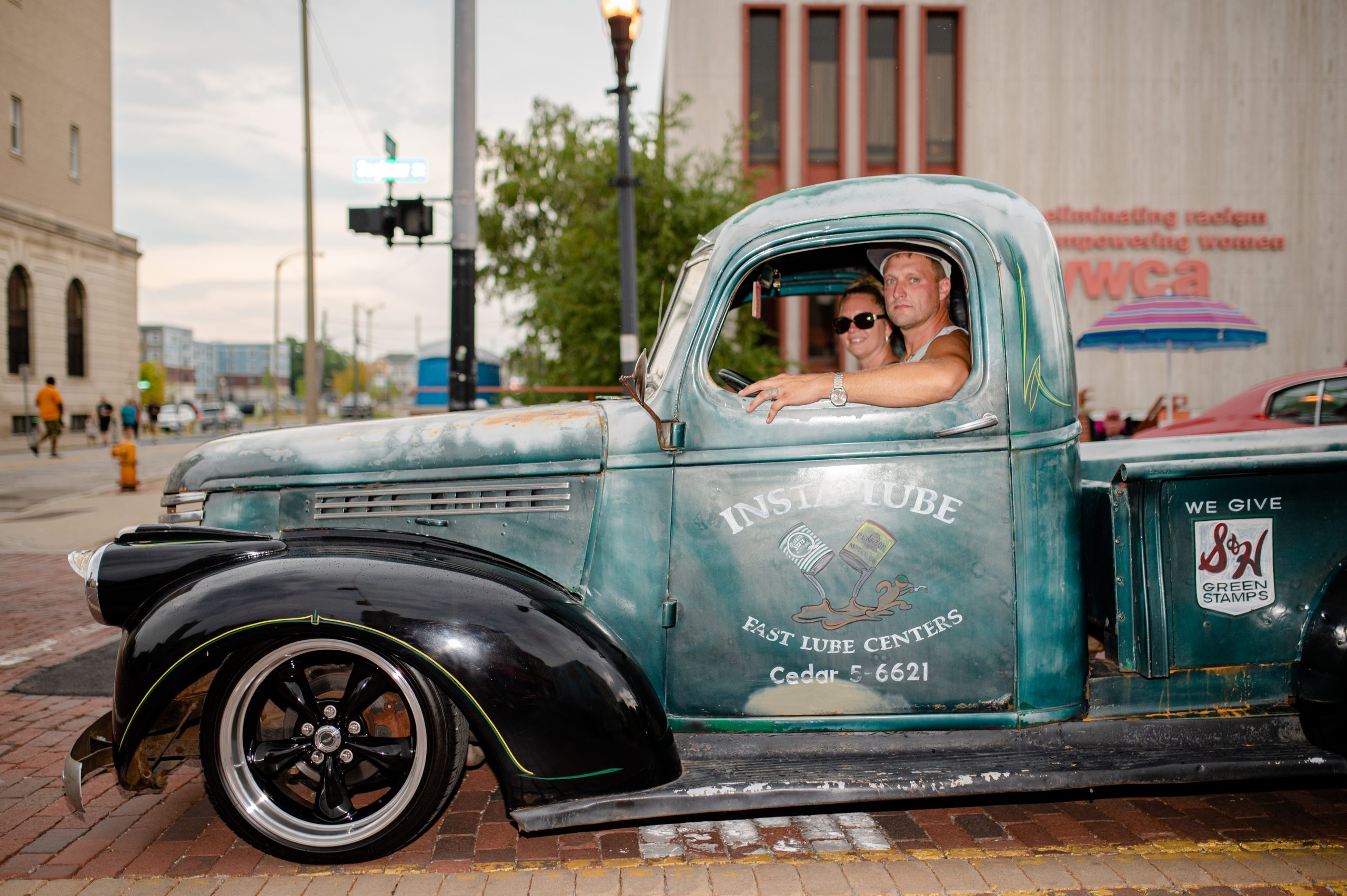 Chris Threet drives a truck from Insta-Lube, a family-owned oil change shop in Flint, Mich., down Saginaw Street during Back to the Bricks in Downtown Flint, Mich. on Saturday, Aug. 20, 2022. (Michael Indriolo | Flint Beat)