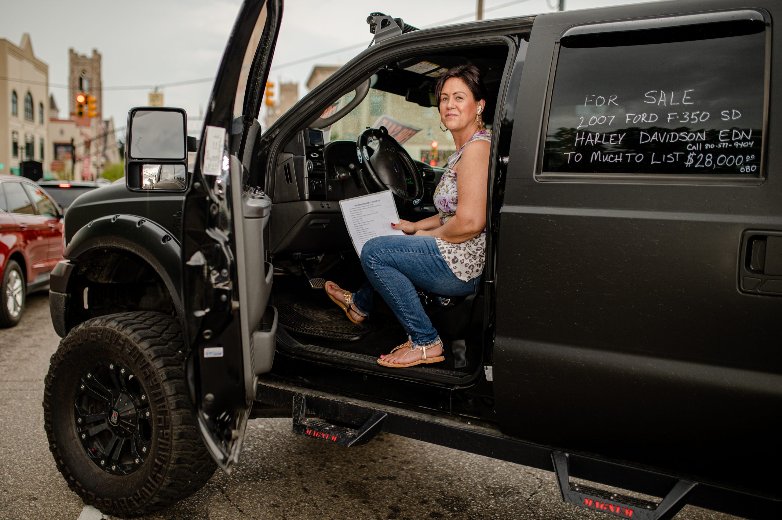 Tonya Alexander, from Mt. Morris, Mich., starts up her custom matte black truck during Back to the Bricks in Downtown Flint, Mich. on Saturday, Aug. 20, 2022. (Michael Indriolo | Flint Beat)