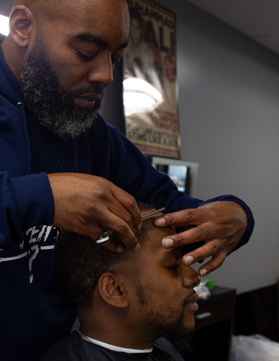 Taking a moment from joking and laughing with everyone in the barbershop, Ronald Johnson pauses to carefully razor the edges of his clients hair. (KT Kanazawich | Flint Beat)