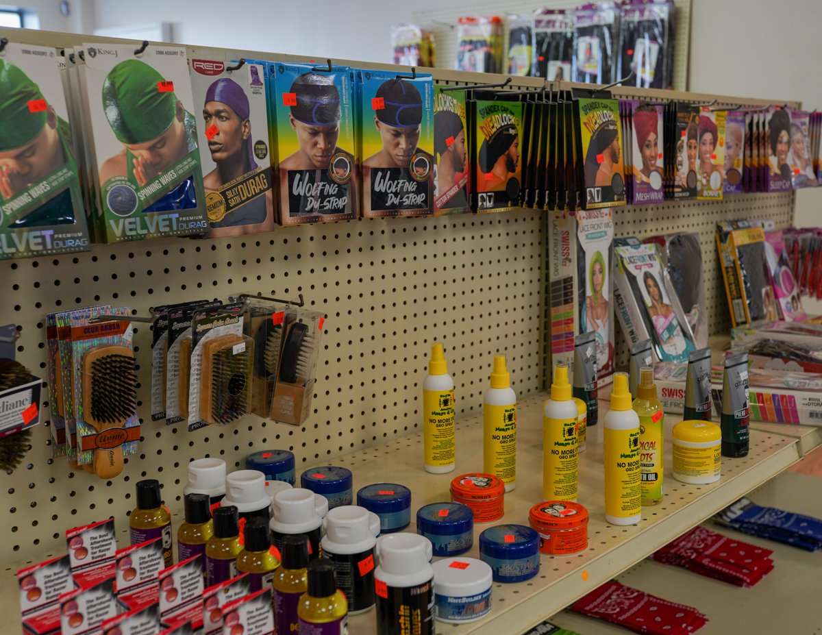 A shelf in Caught My Eye beauty supply shop is stocked with hair products and accessories. (KT Kanazawich | Flint Beat)