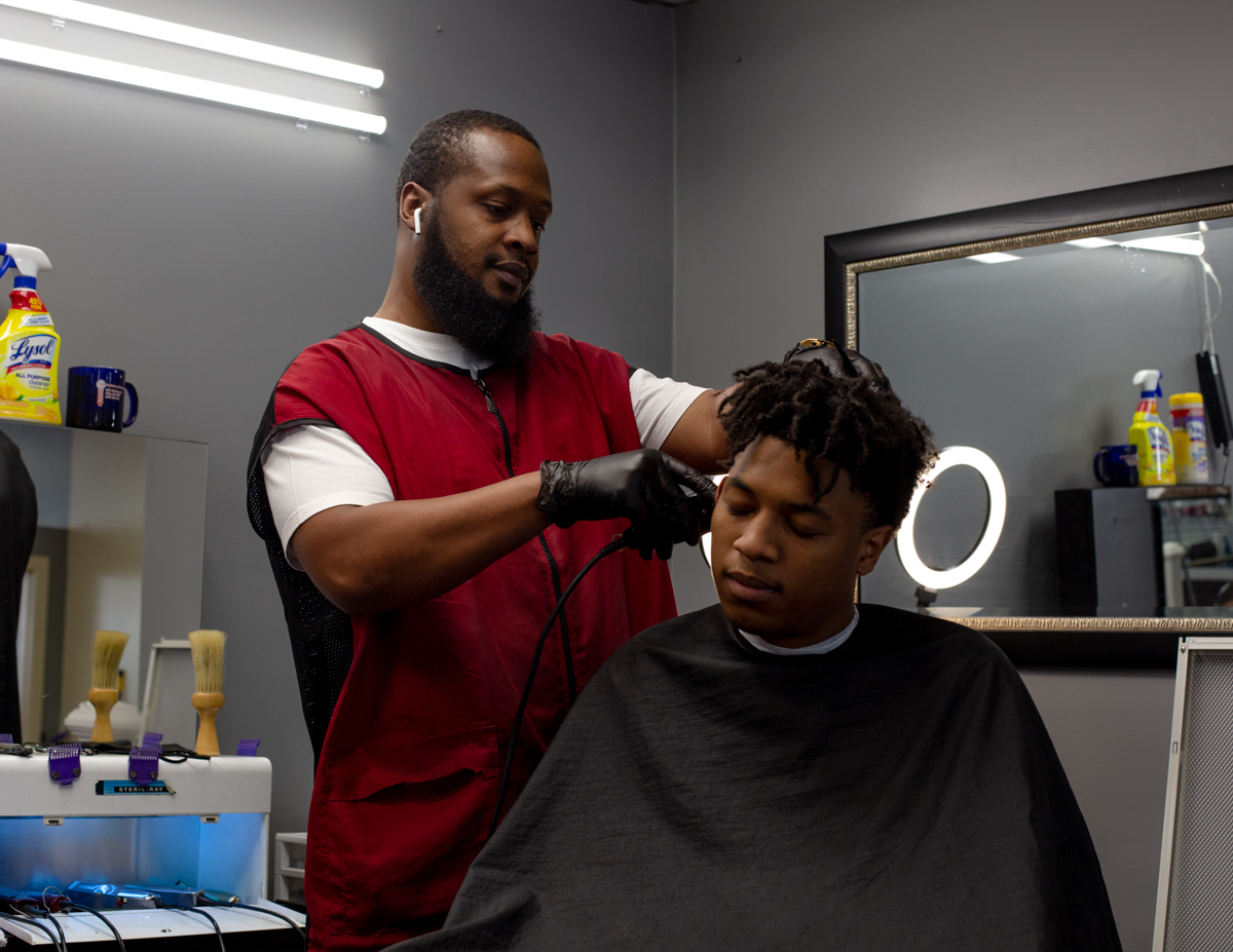Barber Frank Keyes cuts the hair of young Flint rapper BTH TeeJay at Caught My Eye beauty supply and barber shop. (KT Kanazawich | Flint Beat)