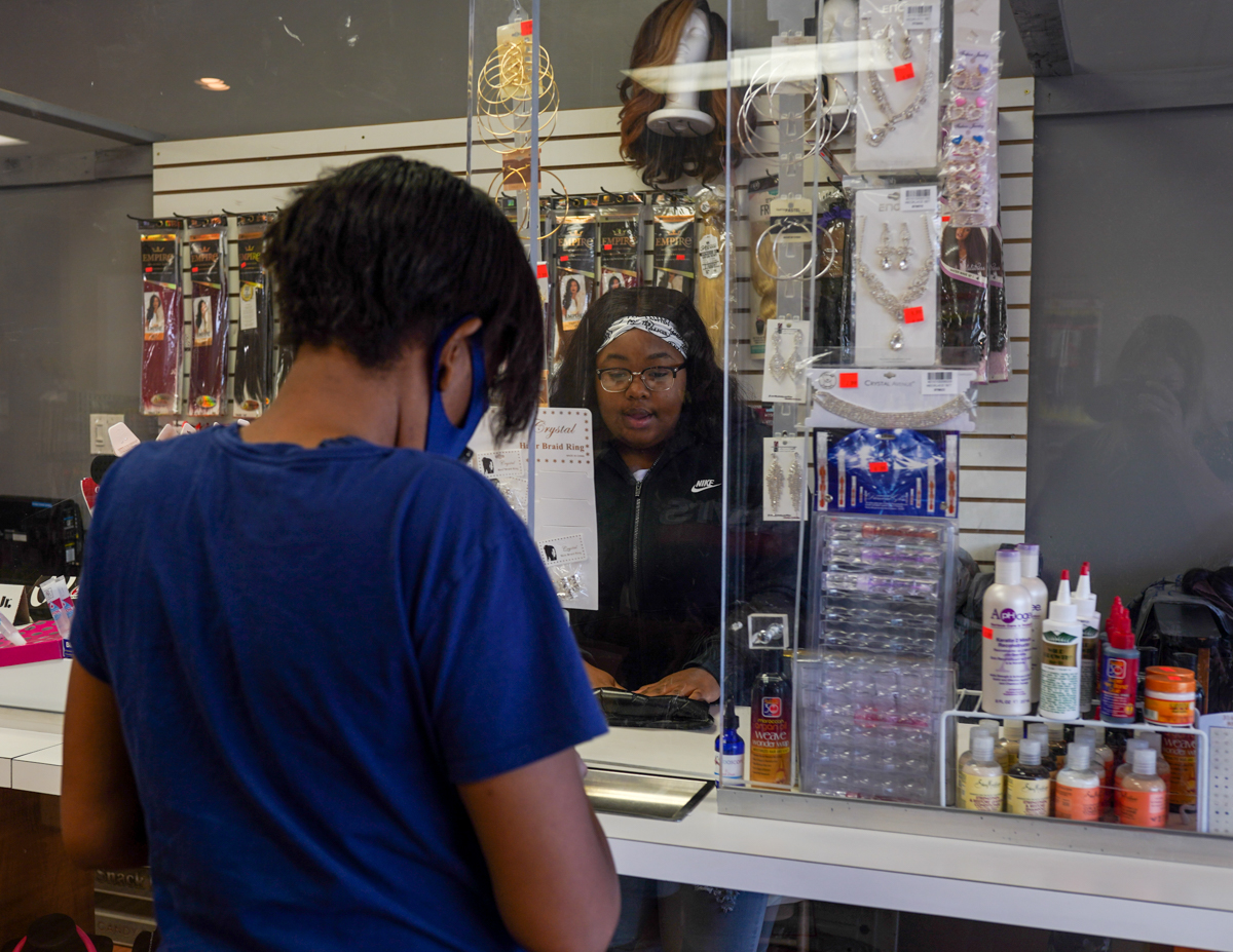 Brianna McMillian rings up a customer at the beauty supply shop she owns with her father, Caught My Eye. (KT Kanazawich | Flint Beat)