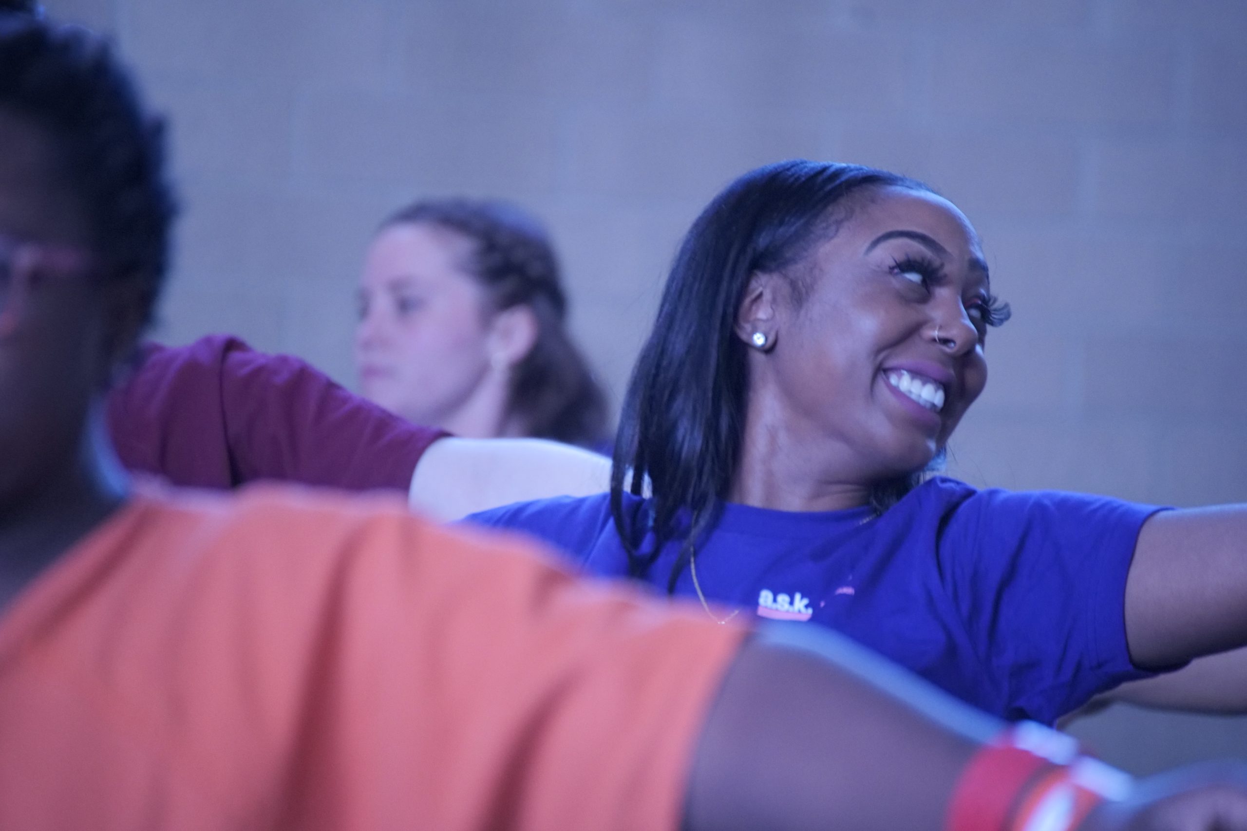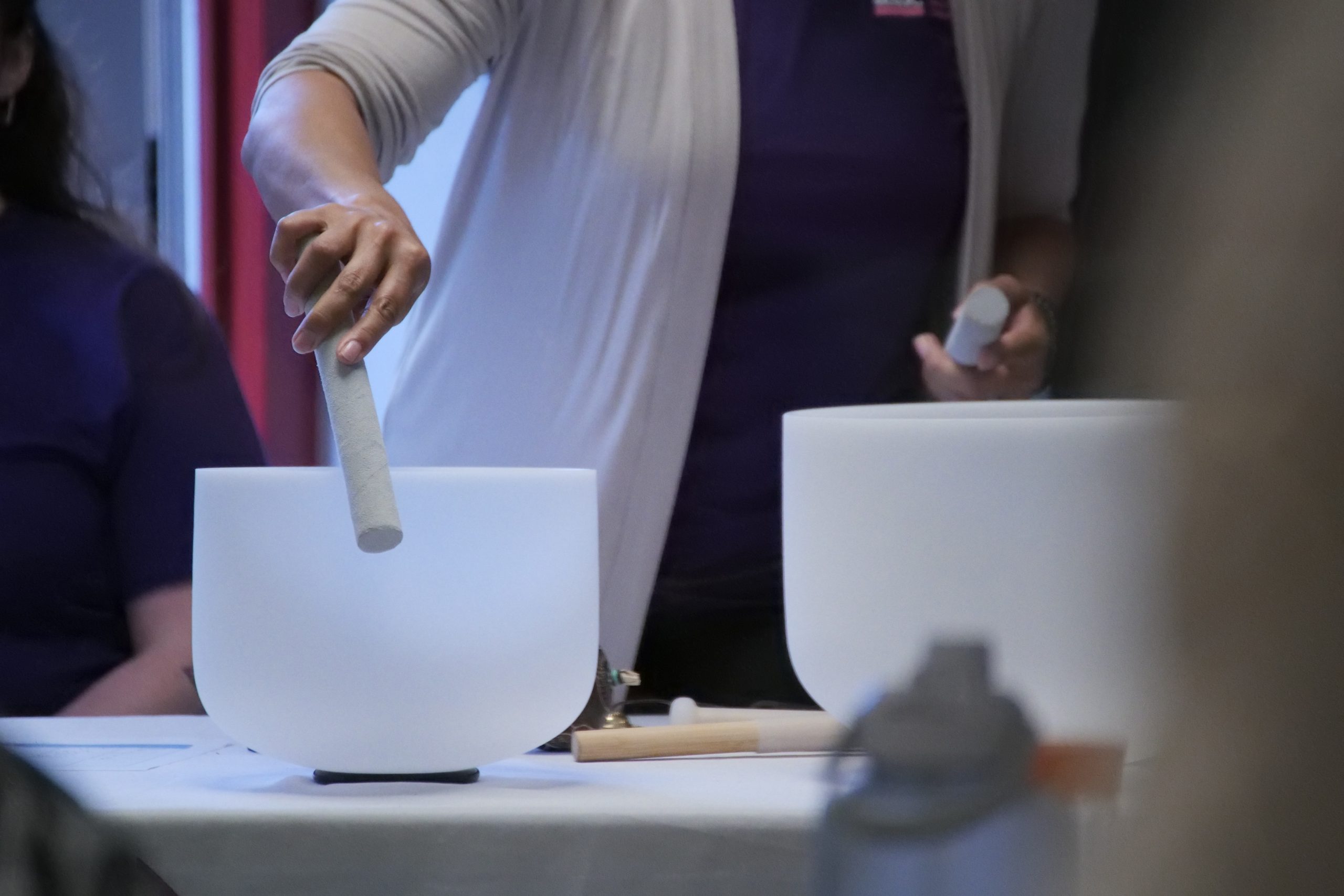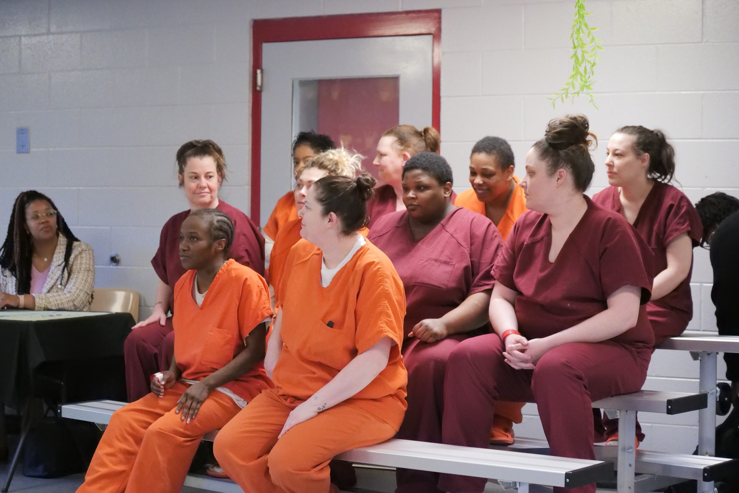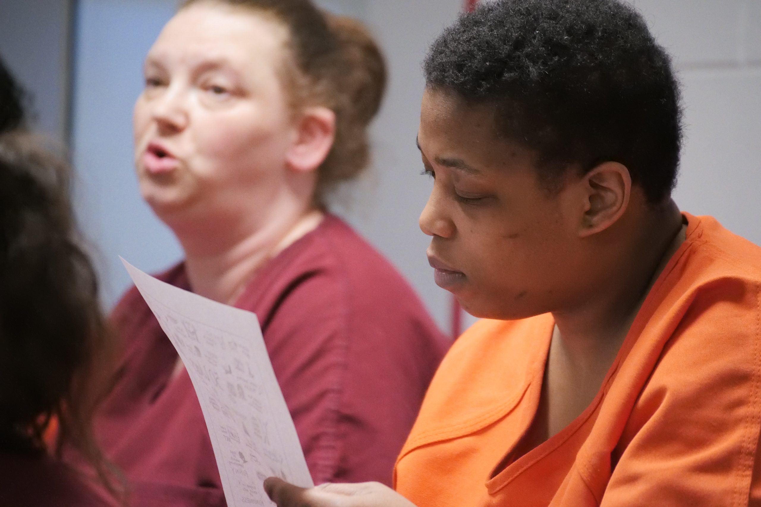 Ka’Sella Matière and Elizabeth Wise of the Crim Fitness Foundation introduce inmates at the Genesee County Jail to mindfulness practices during a May 17, 2024 event at the jail. (Teiko Cornelius | Flint Beat)