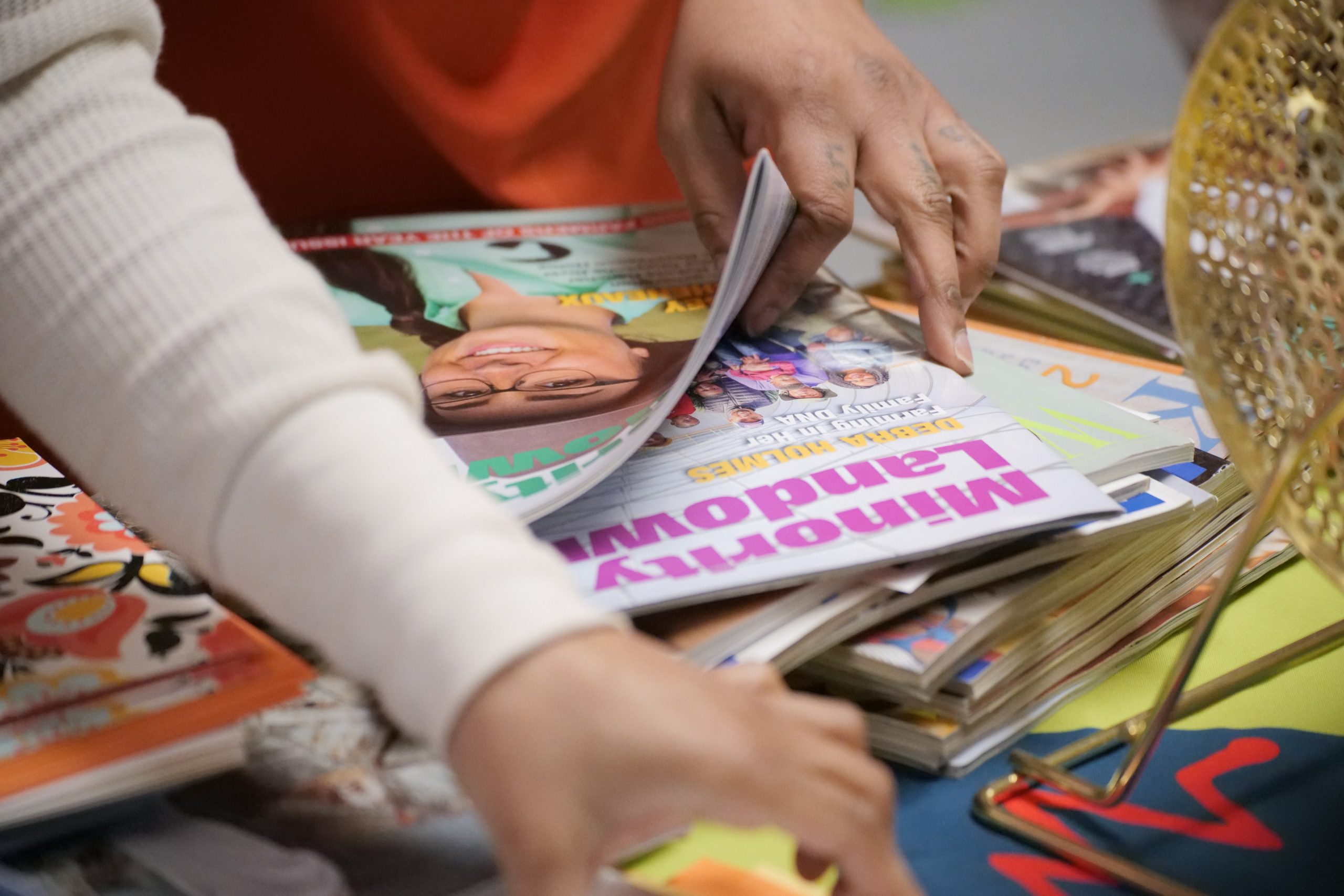 A Genesee County Jail inmate sifts through magazines for a vision board exercise during a mental health event at the county jail on Friday, May 17, 2024. (Teiko Cornelius | Flint Beat)