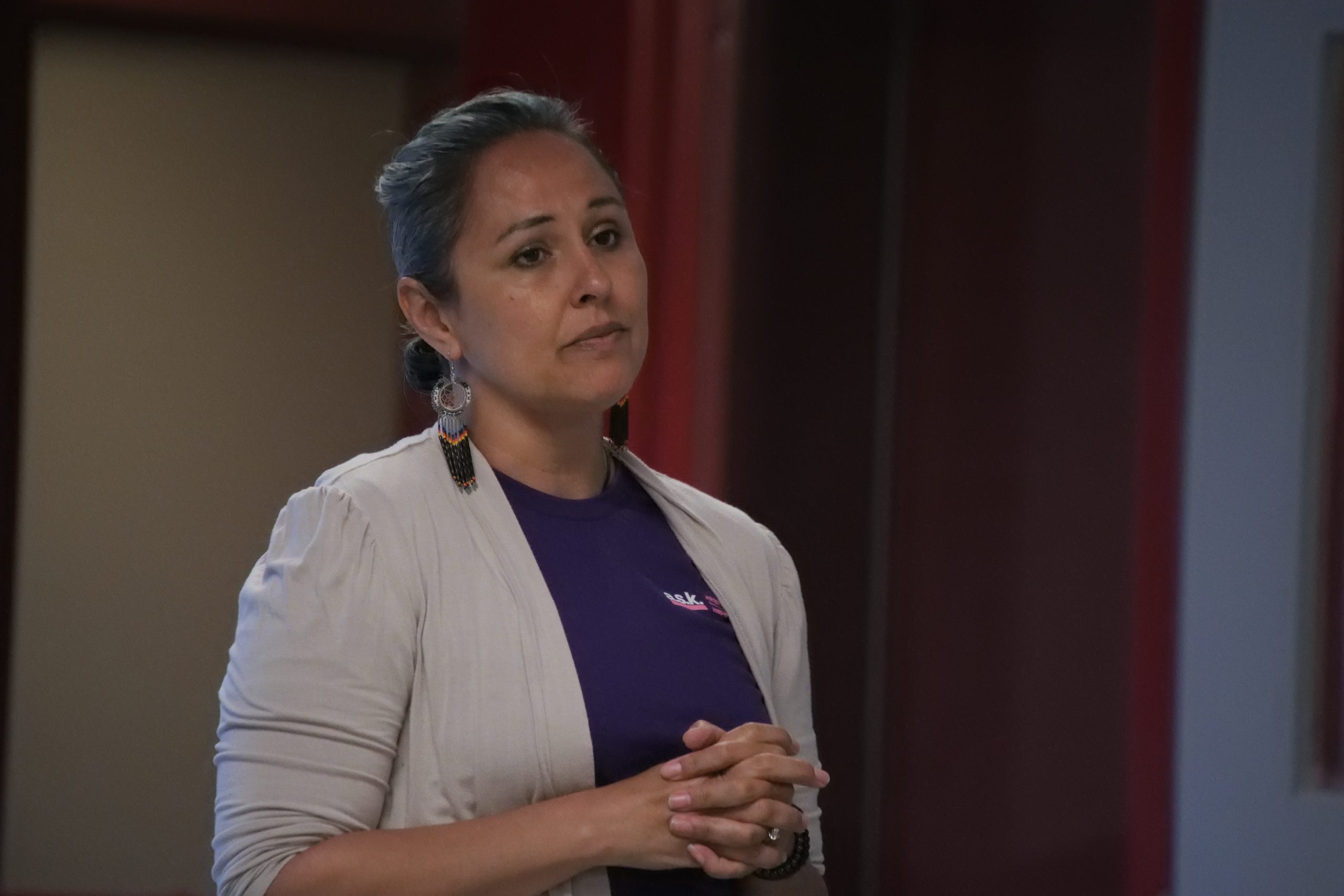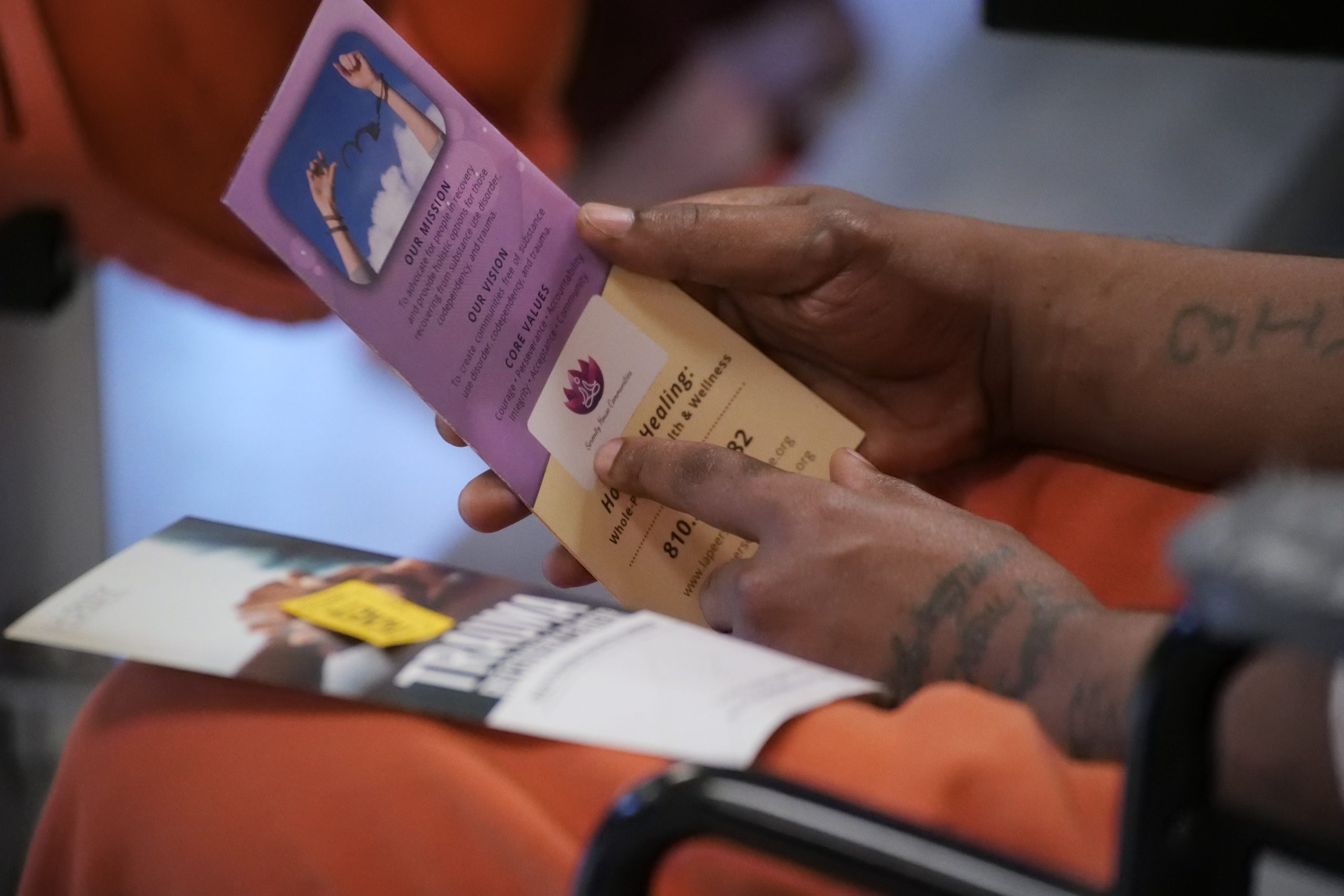 Tara Moreno of Serenity House talked to participants at a Genesee County Jail mental health awareness event about meditation and mindfulness. The May 17, 2024, event was organized by Dee Dee Taylor and Percy Glover on behalf of their nonprofit organizations, Taylor Made and FAIR Voting Alliance. (Teiko Cornelius | Flint Beat)