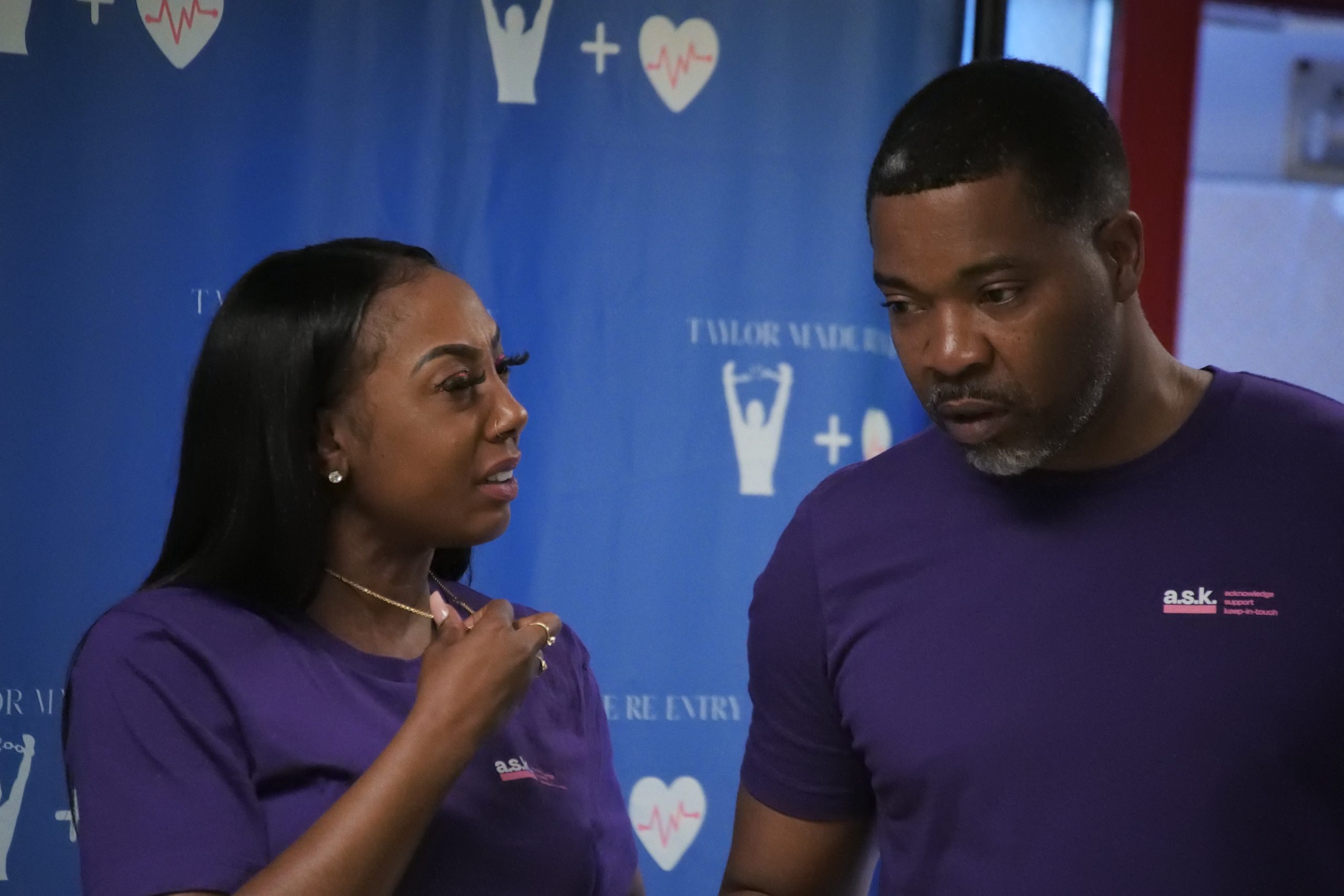 Dee Dee Taylor, founder of Taylor Made Re-Entry and the sister of the late Breonna Taylor, stands with Percy Glover, founder of FAIR Voting Alliance during a mental health event at the Genesee County Jail on May 17, 2024. (Teiko Cornelius | Flint Beat)