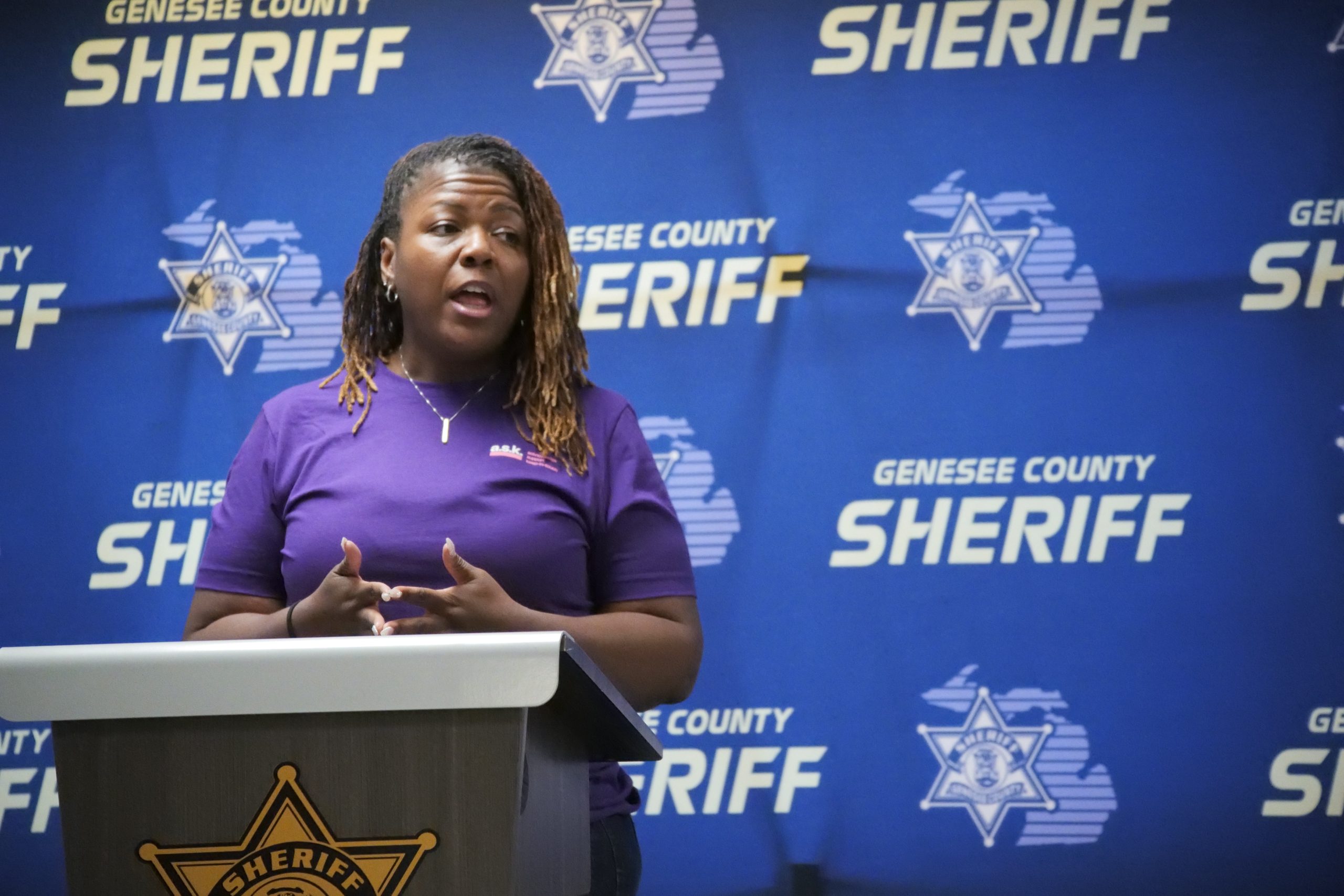 Hurley Medical Center Recovery Center Director, Tia Coles, talks about services offered at Hurley during a mental health event at the Genesee County Jail on May 17, 2024. (Teiko Cornelius | Flint Beat)
