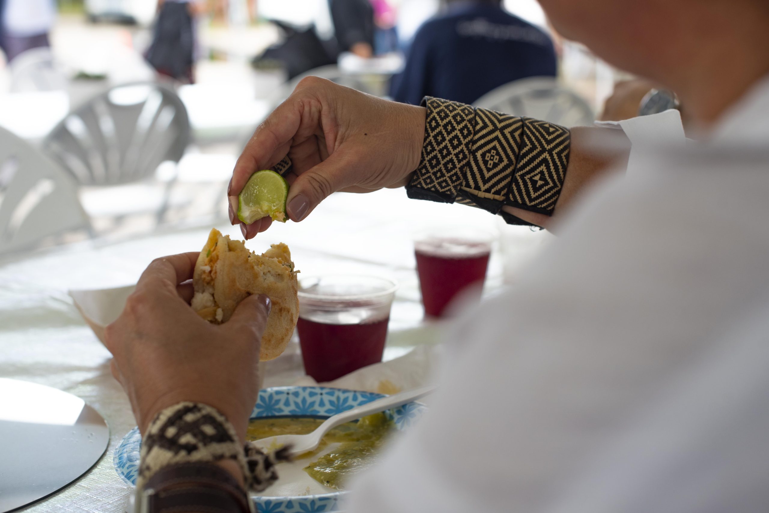 “Hoy tuve la oportunidad de servir comida de mi país, Venezuela, a la comunidad. Mis arepas vienen con la opción de ser rellenas con frijoles negros, pollo o cerdo. Sin embargo, hay mucha más comida aquí que la mía. Aquí hay cocineros de Costa Rica, Cuba y Argentina ”, dijo Calma.