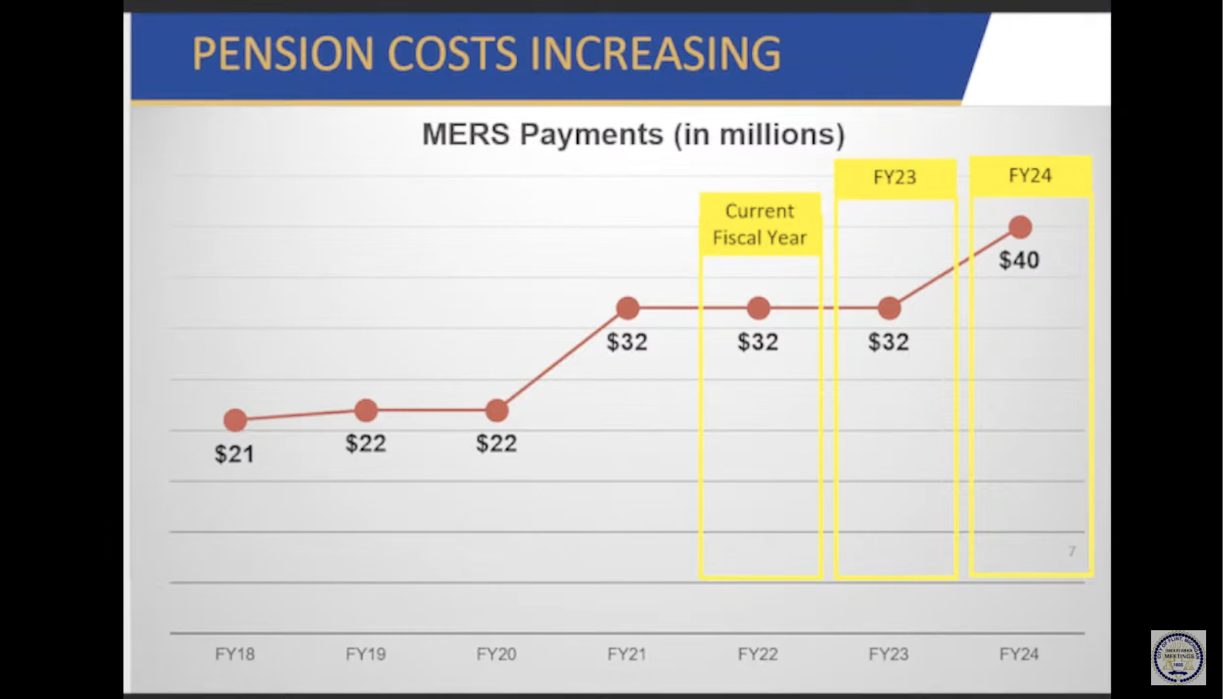 “Now in FY 21, it jumps $10 million to $32 million,” Neeley said. The live stream of the mayor’s presentation swapped from a static image of Neeley to a line graph of the expected pension spending trajectory until 2024.