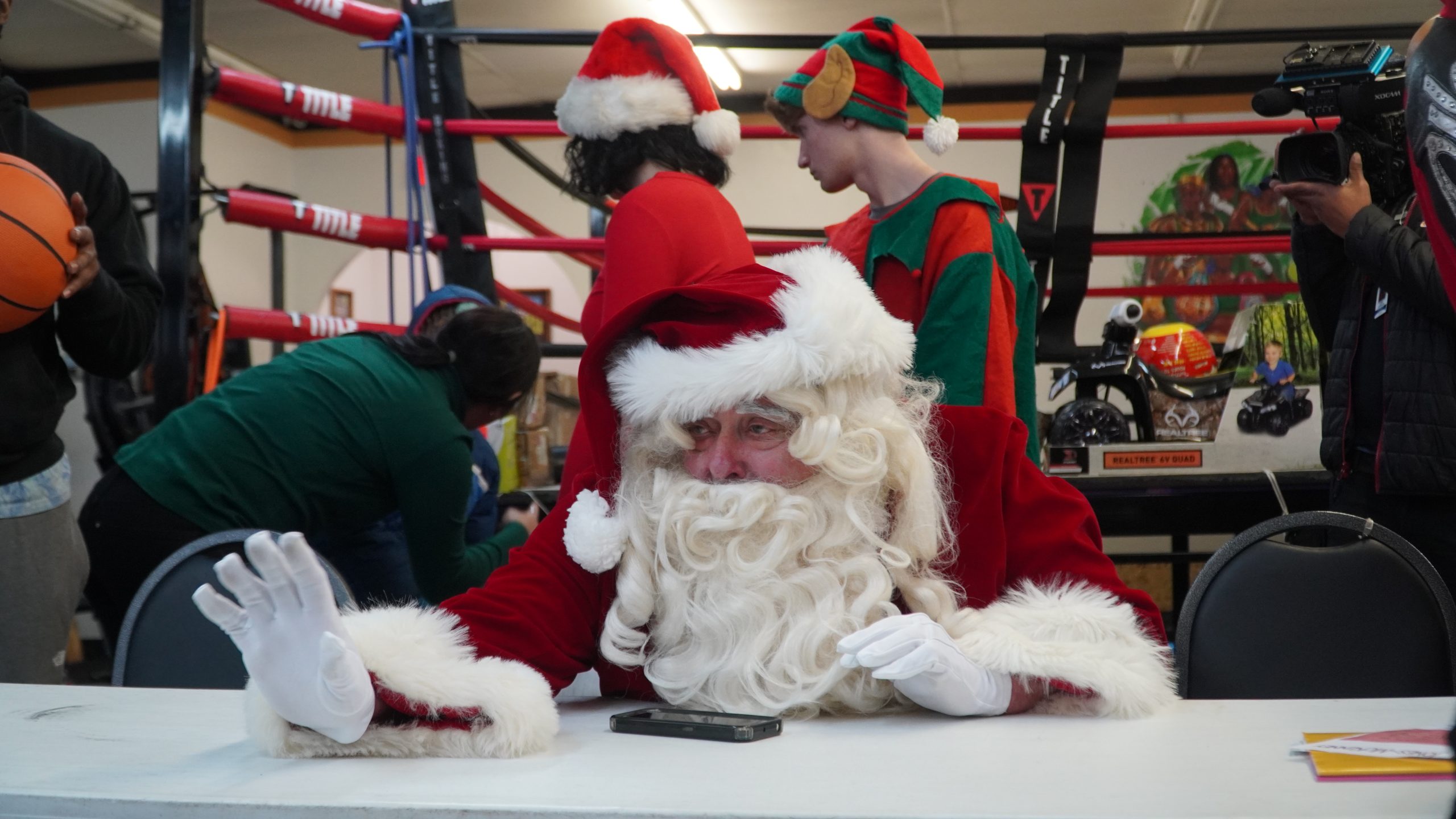 Hundreds of Flint-area families lined up outside of AT Fitness in Mt. Morris Twp., Mich. on Friday, Dec. 23, 2022, for world champion boxer Claressa Shields’ annual Christmas giveaway. (Joshua Johnson | Flint Beat)World champion boxer, Claressa Shields, stops to talk to Flint-area families during her annual Christmas giveaway in Mt. Morris, Twp., Mich. on Friday, Dec. 23, 2022. (Joshua Johnson | Flint Beat)More than $10,000 in toys were given away during Claressa Shields’ annual Christmas giveaway on Friday, Dec. 23, 2022. Gifts included hoverboards, scooters, dolls, games and more. (Joshua Johnson | Flint Beat)Santa Claus takes a break during Claressa Shields’ annual Christmas giveaway on Friday, Dec. 23, 2022 at AT Fitness in Mt. Morris Twp. Mich. (Joshua Johnson | Flint Beat)Claressa Shields poses with a participant of her annual Christmas giveaway where hundreds of families showed up for free toys, food, and winter gear on Dec. 23, 2022. (Joshua Johnson | Flint Beat)