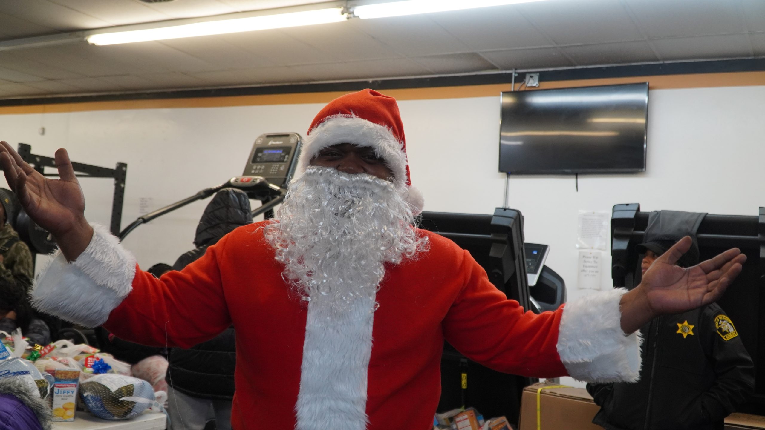 Local comedian Cheese Stixx dressed as Santa Claus for Claressa Shields’ annual Christmas giveaway on Dec. 23, 2022. (Joshua Johnson | Flint Beat)