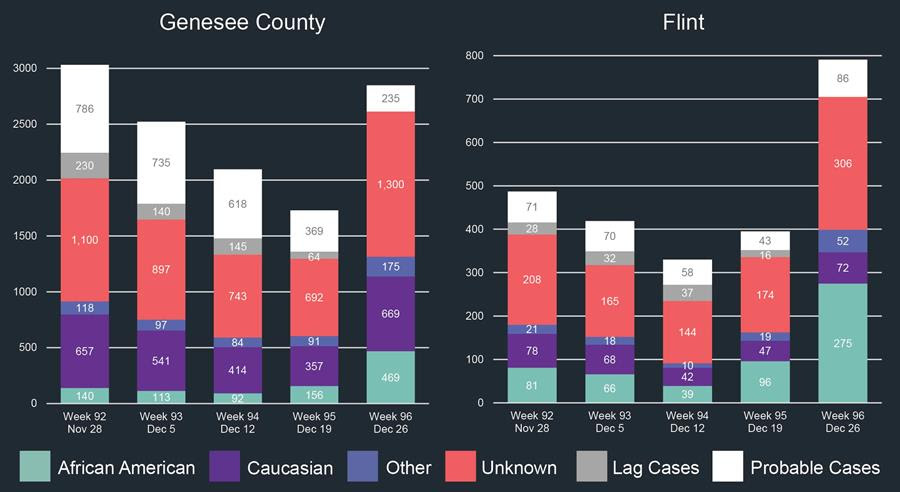 Cases in Genesee County increased from 1,360 to 2,613 for the week of Dec. 26. Of those cases, 705 came from Flint.