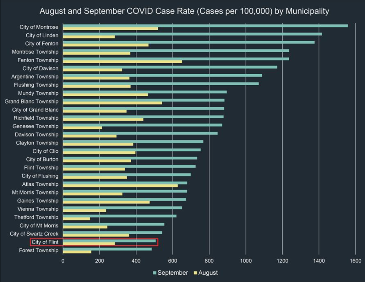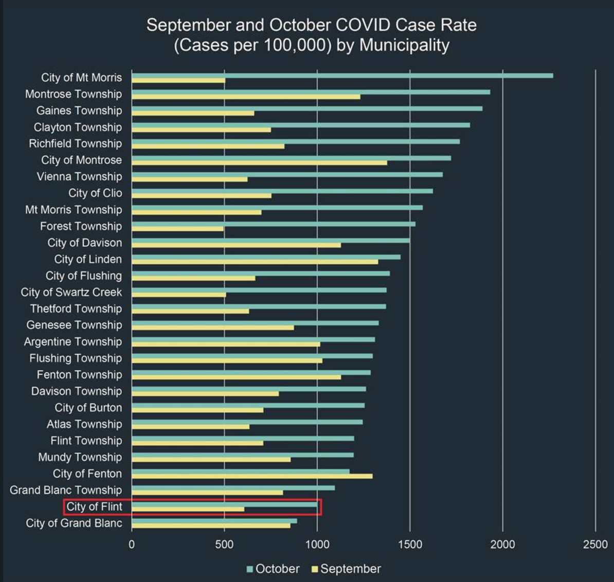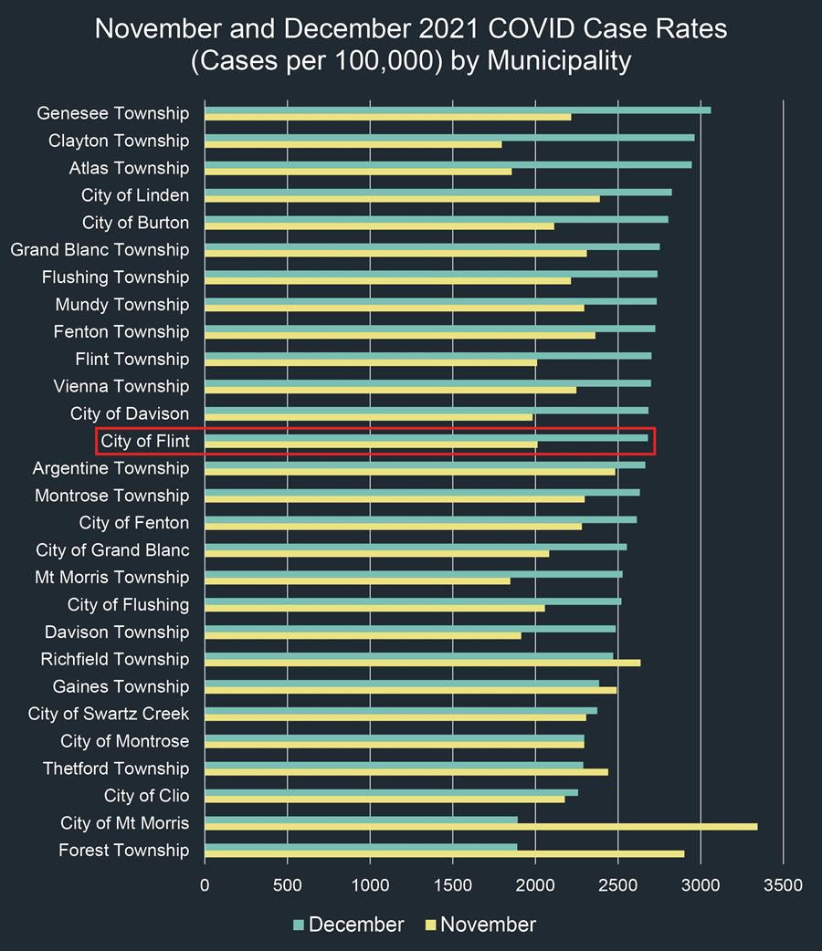 Between August 2021-October 2021, Flint had the second lowest COVID case rate of Genesee County’s 28 municipalities. However, between November and December 2021, Flint rose having the 13th highest case rate, approximately 2,500 cases per 100,000 residents. This “demonstrates a substantial increase in case rates,” according to the FCHES.