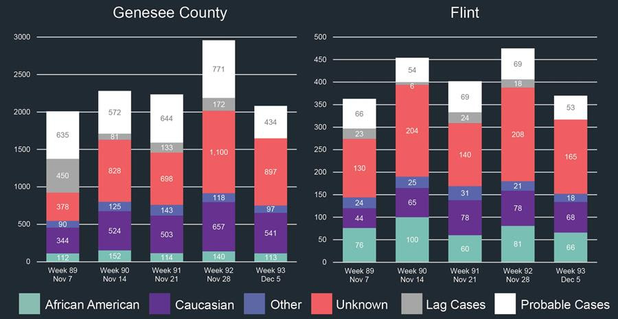 Race data continues to lag. Of the 317 cases reported in Flint for the week of Dec. 5 165 were of an unknown race while 66 were African American.