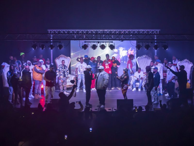 The stage for the Dayton Family/Top Authority Versus event was filled with local rappers, friends, fans, videographers and DJs. The event was held inside the Dort Financial Center on Saturday, Oct. 30, 2021in Burton, Mich. (Santiago Ochoa